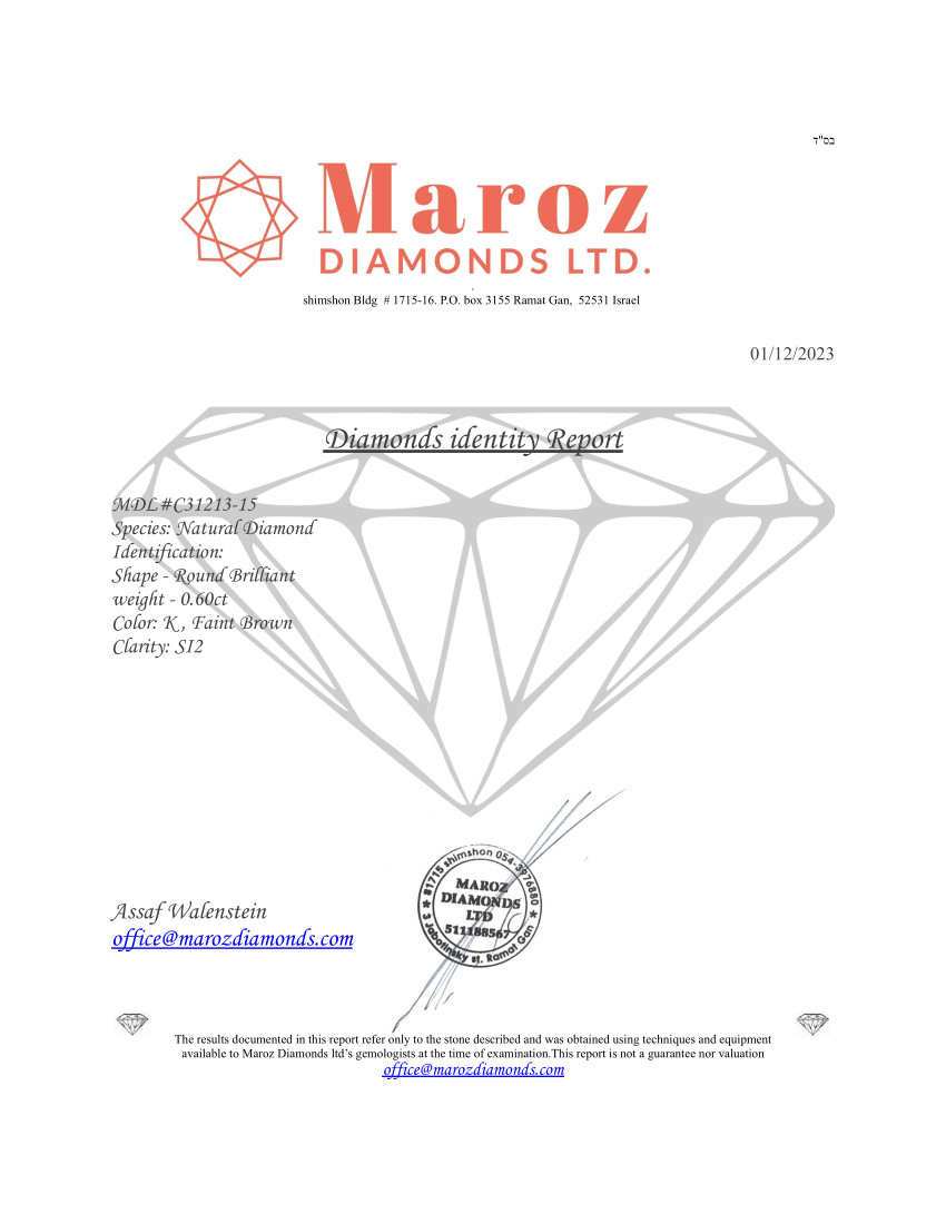 DIAMANTE 0,6 CARATI COLORE K - PUREZZA SI2 - TAGLIO BRILLANTE - CERTIFICATO GEMMOLOGICO MAROZ DIAMONDS LTD MEMBRO ISRAEL DIAMOND EXCHANGE - C31213-15