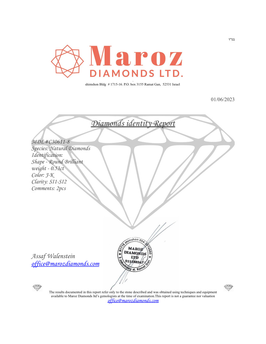 2 DIAMANTI 0,53 CARATI COLORE J - PUREZZA SI1-2 - TAGLIO BRILLANTE - CERTIFICATO GEMMOLOGICO MAROZ DIAMONDS LTD MEMBRO ISRAEL DIAMOND EXCHANGE - C30611-8