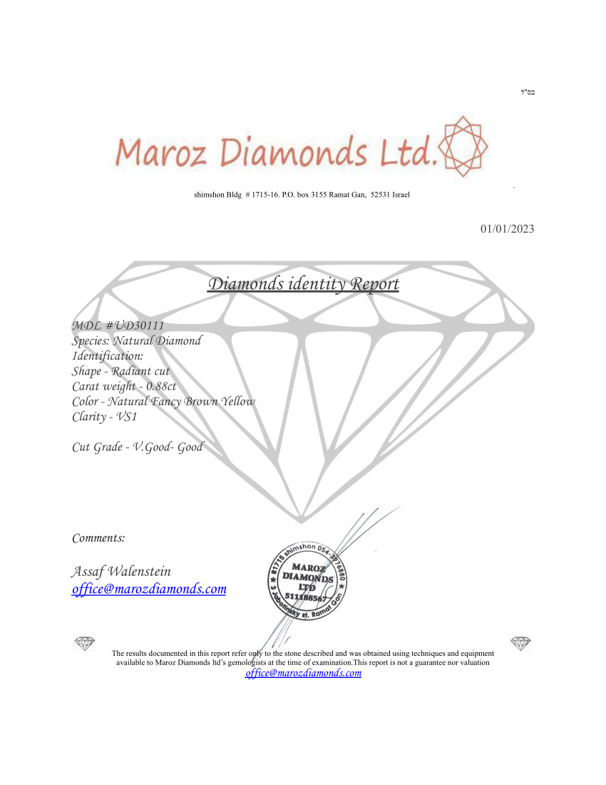DIAMANTE NATURAL POLISHED 0,88 CARATI NATURAL FANCY MARRONE GIALLO - PUREZZA VS1 - TAGLIO RADIANTE - CERTIFICATO GEMMOLOGICO MAROZ DIAMONDS LTD MEMBRO ISRAEL DIAMOND EXCHANGE - UD30111
