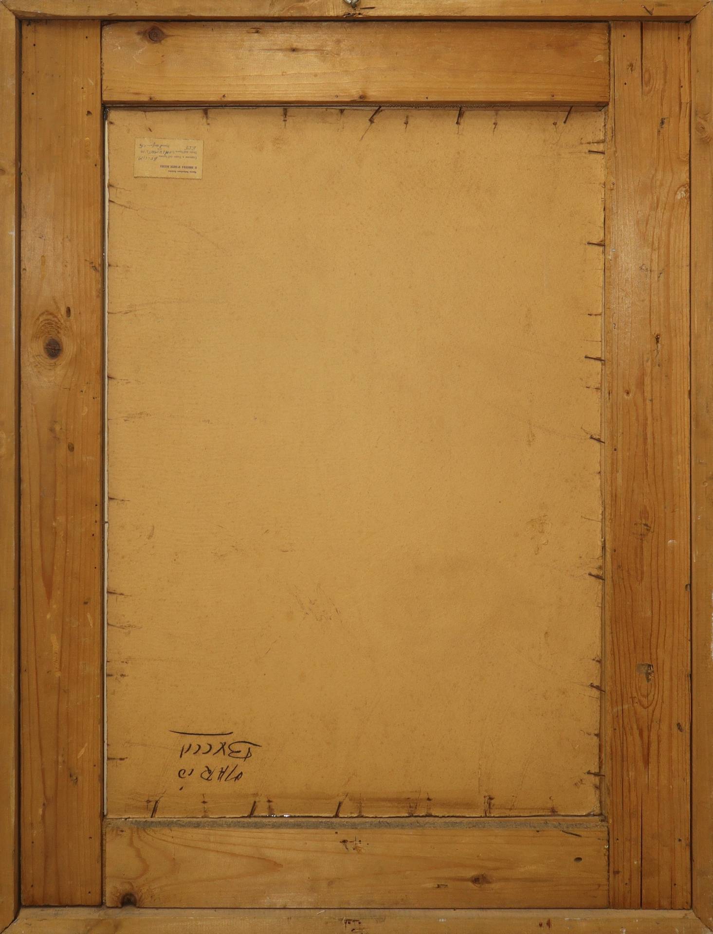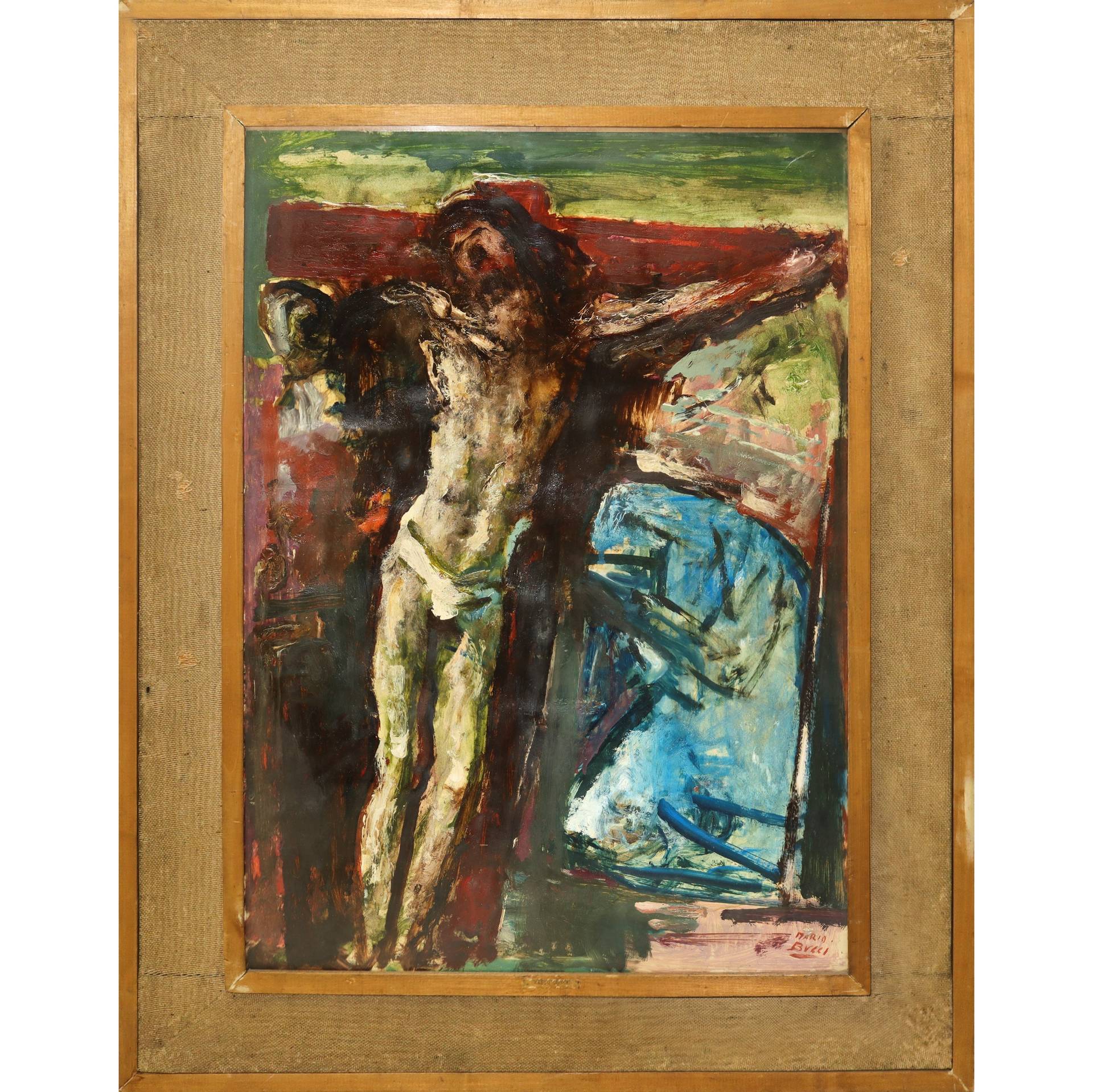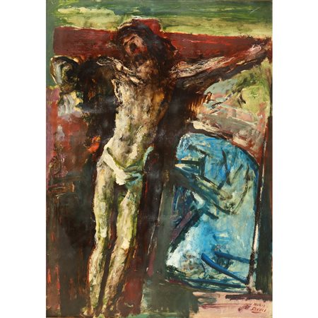 Mario Bucci (1903-1970) - Crocifissione H cm 84x53 - in cornice H cm 92x71 Olio su cartone Firmato al fronte in basso a destra. Al retro firmato e titolato su etichetta Consumatum est.