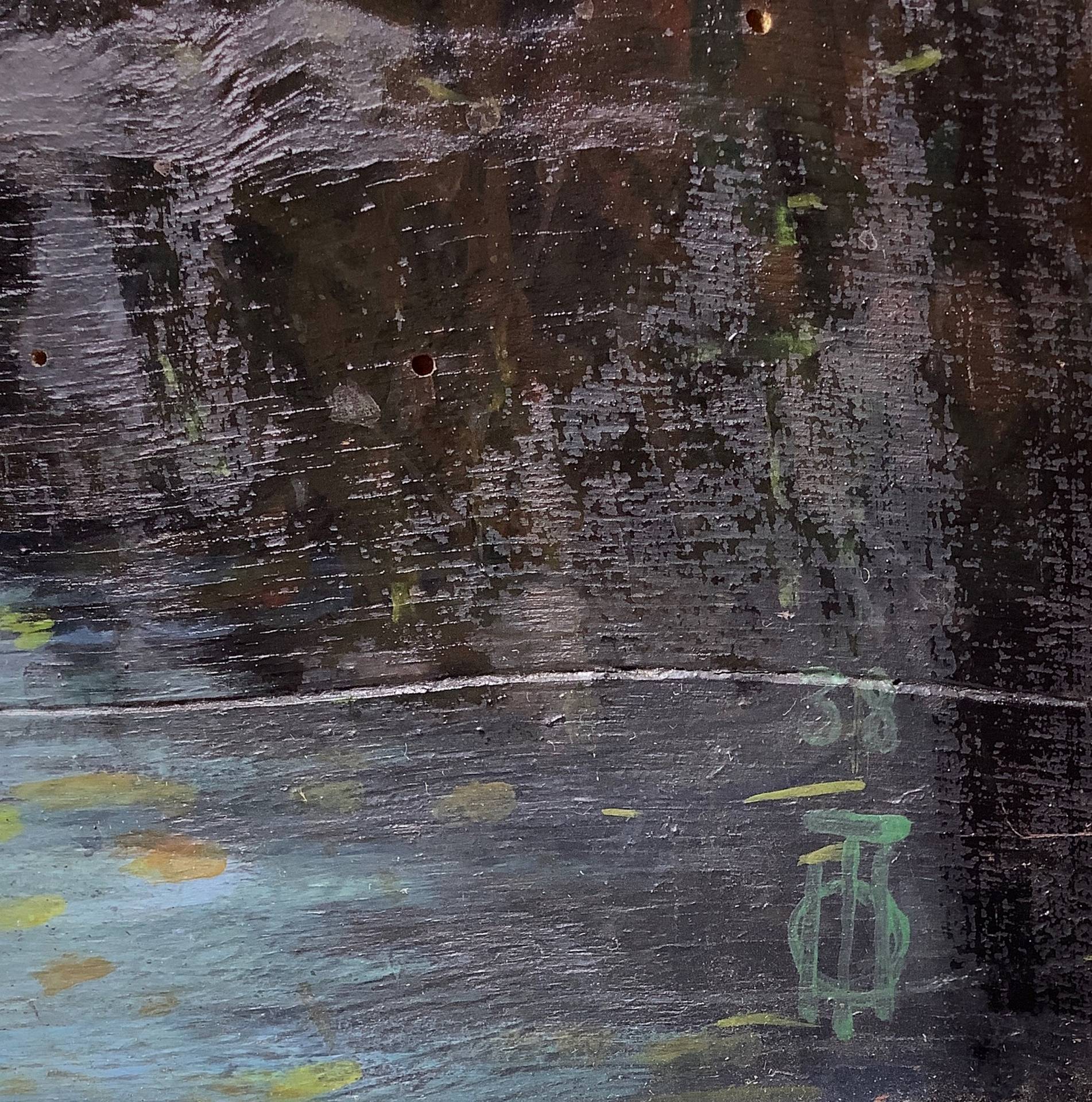 Fiume con alberi al tramonto. Cm 40x60, in cornice cm 67x87. olio su tavola Firmato in basso a destra con pittogramma e datato ‘38