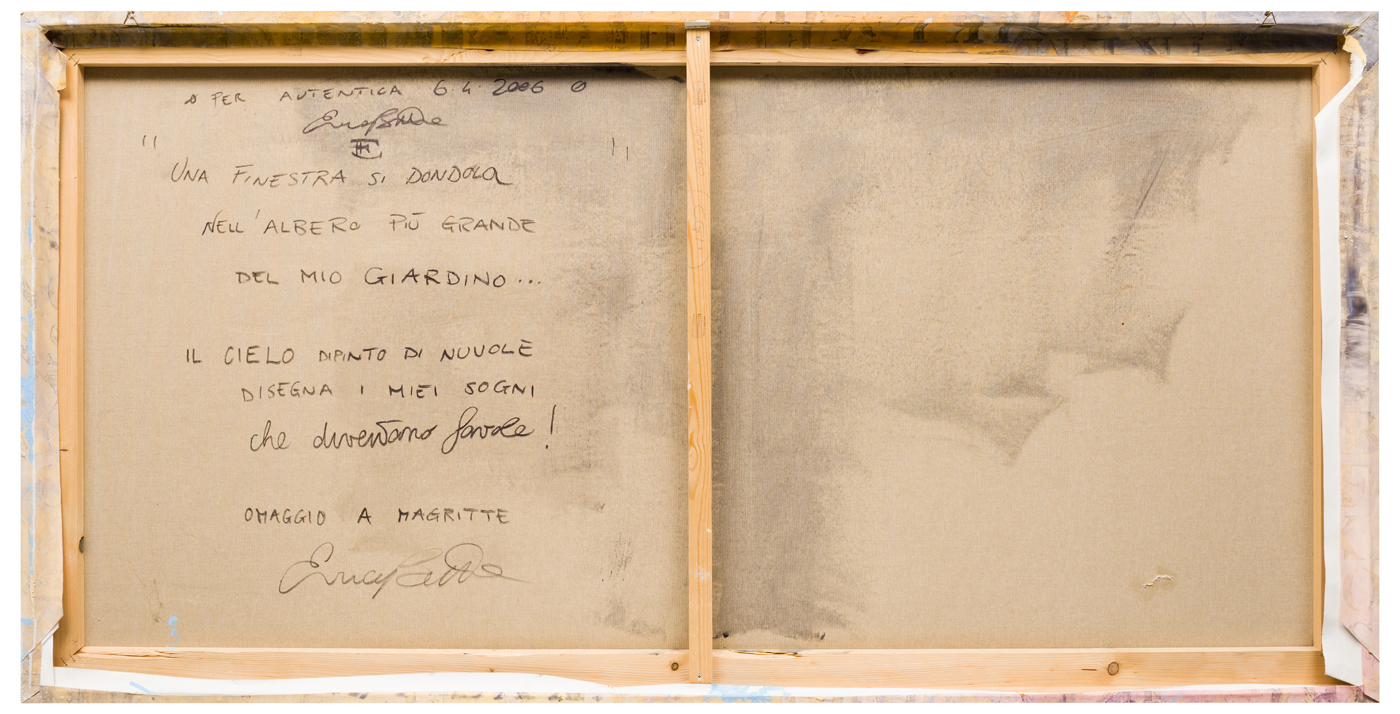 Altre iscrizioni: “Per autentica”, “Una finestra si dondola nell’albero più grande del mio giardino… Il cielo dipinto di nuvole disegna i miei sogni che diventano favole! Omaggio a Magritte” sul verso