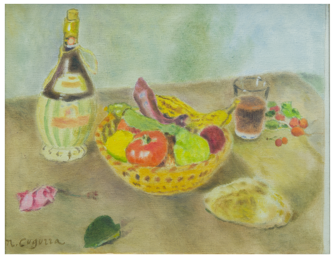 Altre iscrizioni: titolo al verso ("Fiaschetto e bicchiere con vino rosso / Cestino con frutta e verdura / Ravanelli, visciole, pane casareccio / Rosa appassita, foglia di Rosa")