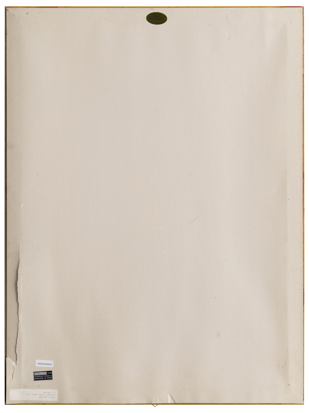 Elementi distintivi: al recto titolo a stampa, a secco marchio della cartiera “Arches France” e marchio delle edizioni Eldec Roma; etichetta anonima con dati dell'opera e due etichette con riferimenti agli inventari della banca