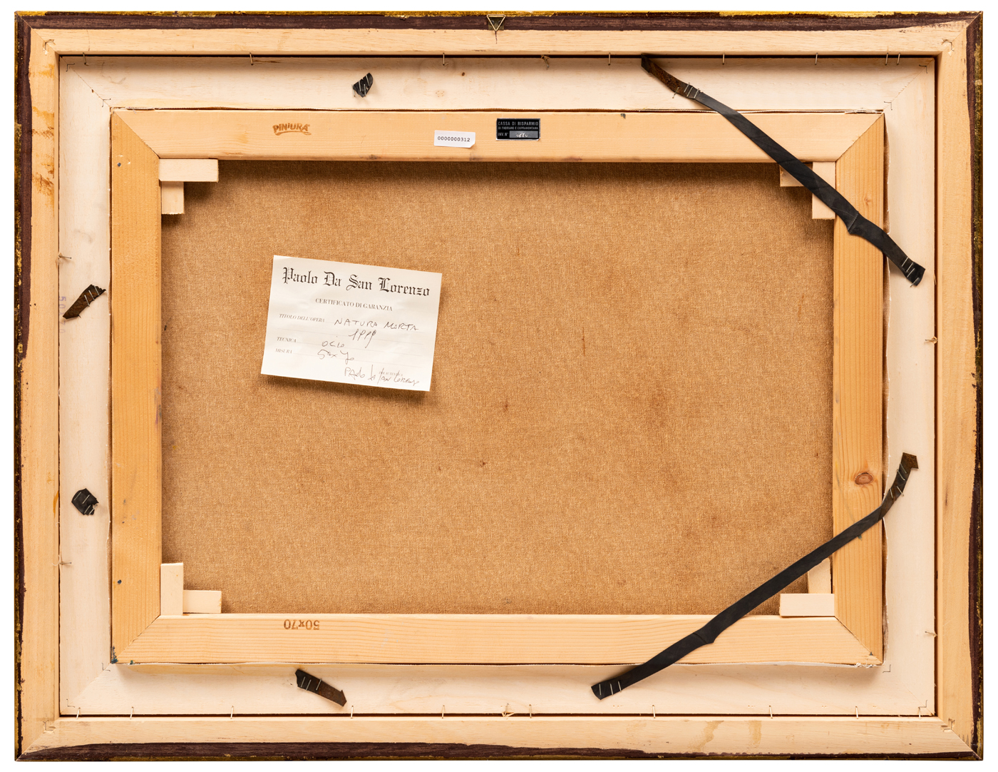 Elementi distintivi: sul telaio due etichette con riferimento agli inventari della banca e stampigliature del produttore e delle dimensioni; al verso della tela certificato di garanzia dell’autore