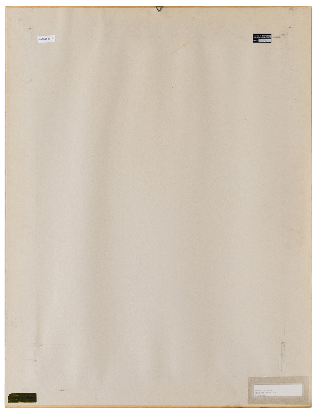 Elementi distintivi: sul verso, etichetta della Cassa di Risparmio di Fabriano e Cupramontana con riferimenti di inventario; una etichetta anonima con dati dell’opera