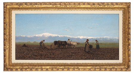 La formazione di Guglielmo Ciardi è segnata dall’alunnato presso l’Accademia di belle arti di Venezia sotto la guida di Domenico Bresolin, rinnovatore del paesaggismo veneto, e dal viaggio di perfezionamento nel 1868 a Firenze, Roma e Napoli, che gli permette di conoscere la pittura di Fattori, Signorini, Costa, Palizzi e Morelli. Alla lezione del “vero” appaiono ispirate le opere della prima maturità dell’artista realizzate tra il 1868 e il 1869 tra il Canale della Giudecca e la campagna trevigiana. Come indicato da Nico Stringa, l’artista volta le spalle alla città edificata per «imboccare la strada di un completo e quasi disarmato colloquio con la “nuda” natura, abbassando al minimo gli elementi narrativi e descrittivi (e decorativi) e le conseguenti potenzialità cromatiche, aprendo la strada a un approccio sintetico» (Nico Stringa, “Guglielmo Ciardi: l’istinto del vero”, in Nico Stringa, “Guglielmo Ciardi. Catalogo generale”, cit., pp. 27-45, p. 37-38). Nei primi anni Settanta i paesaggi lagunari e campestri sono popolati da pescatori e contadini, raffigurati senza retorica all’interno dell’ambiente naturale, che diviene il protagonista assoluto. Appartiene alla serie delle vedute campestri realizzate in questo periodo “L’aratura”, una tela dal caratteristico formato allungato della tradizione macchiaiola. Si tratta di un dipinto di delicato equilibrio, perfettamente bipartito dalla linea dell’orizzonte e costruito sul contrasto tra i toni caldi e terrosi della parte inferiore e i toni freddi di quella superiore. Il bianco e l’azzurro descrivono le variazioni di luce del cielo corrusco di rade nubi e la neve sulla cima dei monti lontani. La scena si svolge alla fine dell’autunno: due uomini completano l’attività dell’aratura, mentre due donne sono pronte alla semina. Si tratta di figure impersonali, ritratte di spalle o di profilo, dai volti irriconoscibili. Ciò che conta è, infatti, il bilanciato e sereno rapporto tra la natura e le attività umane. La pacata gestualità delle figure assume una dimensione mitica, in analogia con la contemporanea pittura dei campi francese da Millet a Breton.