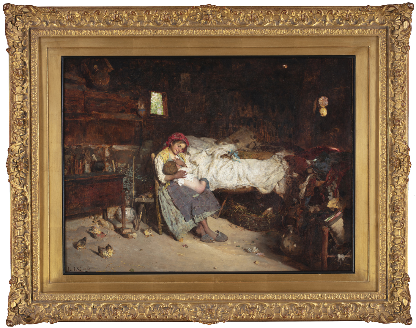 Salutato da Camillo Boito come rinnovatore insieme a Giacomo Favretto della scuola pittorica veneziana, Luigi Nono si perfeziona nel 1876 a Firenze, Roma e Napoli e nel 1878 è a Parigi e Vienna. Il realismo macchiaiolo e il patetismo degli Induno, costituiscono il cardine della sua prima produzione, coronata dalla consacrazione con “Refugium peccatorum” (Roma, Galleria Nazionale d’Arte Moderna) presentato all’Esposizione internazionale di Roma del 1883. Sin dalla metà degli anni Settanta è evidente nella sua produzione un precoce interesse per gli interni domestici, in cui viene sperimentata la luce radente di ascendenza fiamminga. Un umile casolare con un giaciglio e pochi poveri arredi e suppellettili è scenario di tre dipinti realizzati tra il 1881 e il 1885, in cui per la prima volta l’ambientazione cittadina, che compariva in “Il bambino malato” (collezione privata) del 1876 di analoga composizione, cede il passo a una dimensione rustica. È del 1881 “La povera madre”, una figura femminile di spalle che veglia un bambino addormentato. Lo stesso interno è ripreso in “Vice mamma,” presentata nel 1882 alla Promotrice di Torino e al Circolo Artistico Veneziano, dove ottiene il premio offerto dal barone Raimondo Franchetti e viene acquistata dal collezionista Giulio Rocca Lucca. A differenza della povera madre, di cui non si vedeva il volto, ma si poteva intuire dalla posa riversa sul letto la stanchezza e la mestizia, la vice mamma è una fanciulla dalle guance rubiconde, che tiene stretto al petto un bambino paffuto e rosato, conferendo alla composizione un tono gioioso. L’ambiente rustico e umile è ravvivato dal candore delle lenzuola, da una pianta fiorita e da una nidiata di pulcini, che razzolano sul pavimento. Dalla finestra, quasi un pertugio, si intravede una campagna verde e feconda. È interessante come Nono sia riuscito attraverso alcuni dettagli a creare in un ambiente identico due scene di registro opposto. L’opera, apprezzatissima e replicata l’anno successivo in dimensioni leggermente inferiori, è ancora esposta nel 1901 nella mostra personale dedicata all’artista dalla Biennale di Venezia, dove cattura l’attenzione di Giovanni Cena - “nei piccoli quadri è riuscito a concentrare in una fattura squisita un sentimento gentile” (Giovanni Cena, “L’Esposizione veneziana”, in “Nuova Antologia”, XCIII, serie IV, 1901, 715, p. 535) - e di Gilberto Secretant - “coi piccoli quadretti di genere come […] ‘Vice-mamma’ l’artefice raggiunge una solidità degna di un antico fiammingo, ma col più moderno senso della vita” (Gilberto Secretant, “Luigi Nono all’Esposizione di Venezia”, in “L’Illustrazione italiana”, XXVIII, 1901, 37, p. 194).