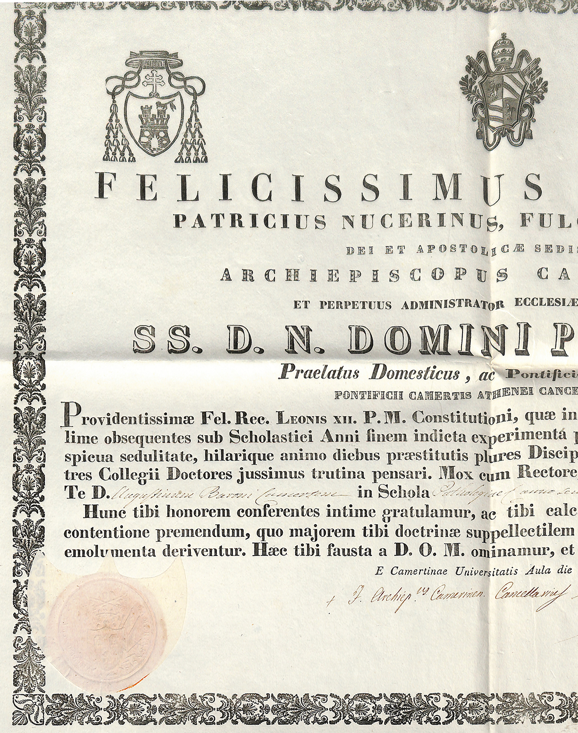 Diploma a stampa datata 'E Camertinae Universitatis Aula die 21 Julii 1847'. Sulla base della Costituzione apostolica emanata nel 1824 da Leone XII 'Quod Divina Sapientia' l'alto prelato conferisce il primo premio in 'Schola Pathologiae' ad Agostino Baroni. Il documento costituisce uno tra i primi atti emanati nel lungo governo del Salvini, che resse la cattedra di Camerino dall’aprile 1847 sino alla morte nel 1893 e alle ampie consuetudini instaurate tra la sede arcivescovile e l’università locale. In-Folio. Bel sigillo in cera sotto carta, ottimamente conservato.