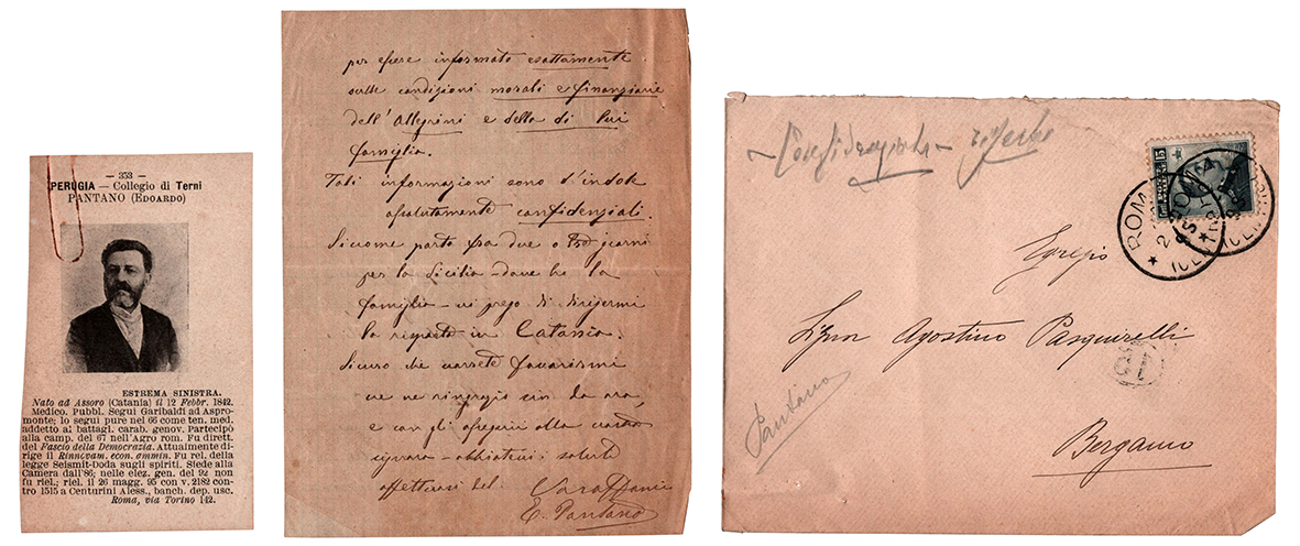 Patriota e uomo politico repubblicano, seguì Garibaldi in Aspromonte (1862), nella campagna del 1866 e in quella dell'Agro Romano (1867); fu arrestato (1869) per la partecipazione al tentativo insurrezionale di Milano, e di nuovo (1870) per aver contribuito a indurre Mazzini a recarsi in Sicilia. Deputato al parlamento (1886-92 e 1895-1921), fu ministro dell'Agricoltura (1906) e dei Lavori pubblici (1919-20); senatore (dal 1921). Diresse il giornale mazziniano 'Il dovere', il radicale 'Fascio della democrazia' e, per circa un anno, 'Il secolo'. Oltre al Mazzini, ebbe rapporti di assidua collaborazione con Aurelio Saffi, che fu il principale erede politico di Mazzini. Lettera autografa firmata, datata Roma 10.9.1896 diretta al garibaldino e giornalista Agostino Pasquinelli (1840-1919), al quale chiede "informazioni precise intorno al Sig. Gottardo Allegrini tenente presso il deposito governativo degli stalloni in Catania...". Due pagine in-16, su carta intestata. Uniti busta viaggiata e ritaglio di foglio "Perugia-Collegio di Terni" con fotografia e biografia di Pantano.