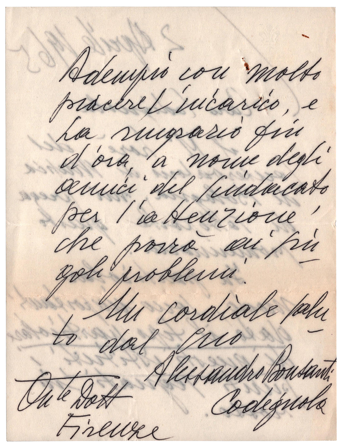 Lettera autografa firmata, datata '2 Aprile 1965' dello scrittore e uomo politico, direttore del Gabinetto scientifico-letterario Vieusseux (dal 1941) e sindaco di Firenze nel 1983. "Il M. Loré del Conservatorio di musica di Bologna, mi prega di sottoporle questo promemoria. In particolar modo, sono importanti, dato il tipo particolare di questi istituti, i punti segnati in rosso. Adempio con molto piacere l'incarico, e la ringrazio fin d'ora, a nome degli amici del sindacato...". Martino Lorè fu un celebre oboista, docente al Conservatorio di Bologna. Due pagine in-8.