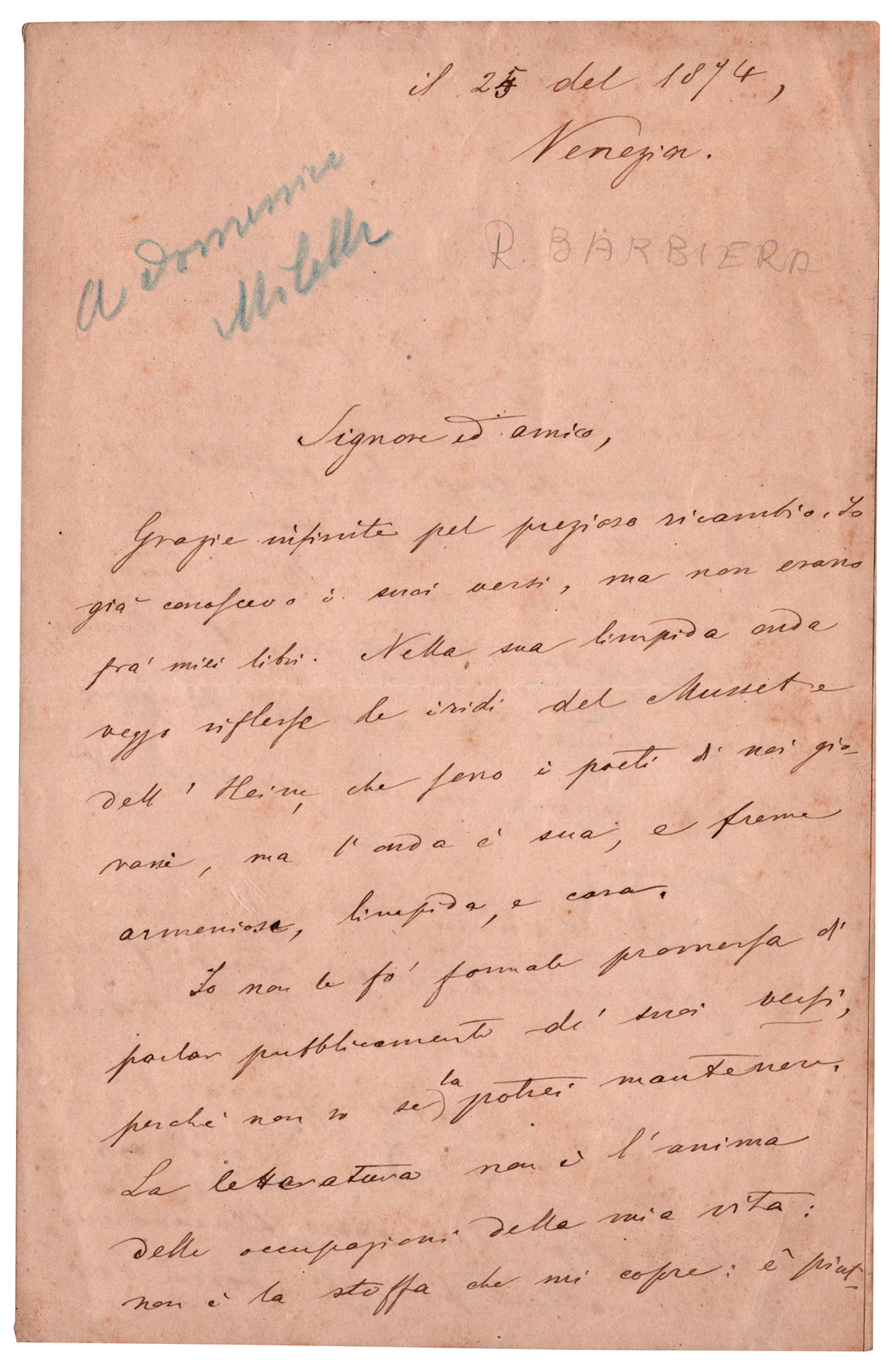Scrittore e giornalista, nel gennaio 1876 Eugenio Torelli Violler (che allora dirigeva il quotidiano 'La Lombardia') lo chiamò a Milano a far parte della costituenda redazione del nuovo quotidiano, 'Il Corriere della Sera', che stava fondando; vi rimase come redattore dal primo numero (5 marzo 1876) fino al 1882, e continuò poi per più anni la collaborazione letteraria. Bella lettera giovanile autografa firmata, datata 'il 25 del 1894, Venezia', diretta al poeta e garibaldino Domenico Milelli (come riporta nota a matita blu di altra mano). "Grazie infinite pel prezioso ricambio. Io già conoscevo i suoi versi, ma non erano fra' miei libri. Nella sua limpida onda veggo riflesse le iridi del Musset e dell'Heine, che sono i poeti di noi giovani, ma l'onda è sua; e freme armoniosa, limpida e cara. Io non le fo' formale promessa di parlar pubblicamente de' suoi versi, perché non so se la potrei mantenere. La letteratura non è l'anima delle occupazioni della mia vita: non è la stoffa che mi copre: è piuttosto un sorriso fra le noje di cure amministrative, è frangia che mi adorna. L'amico Costanzo ha aspettato per ben quattro mesi una mia breve recensione sulle sue ottime poesie nella Gazzetta di Venezia; l'illustre Massarani ne ha aspettati cinque: aspetta ancora un mio giudizio il Carducci. Nulladimeno, darò a leggere i suoi versi a' miei amici (alle amiche no, perché potrebbero storcere il nasino a qualche poesia un po' troppo realista) e sono sicuro che i suoi bei versi piaceranno...". Tre pagine in-8, su bifolio.