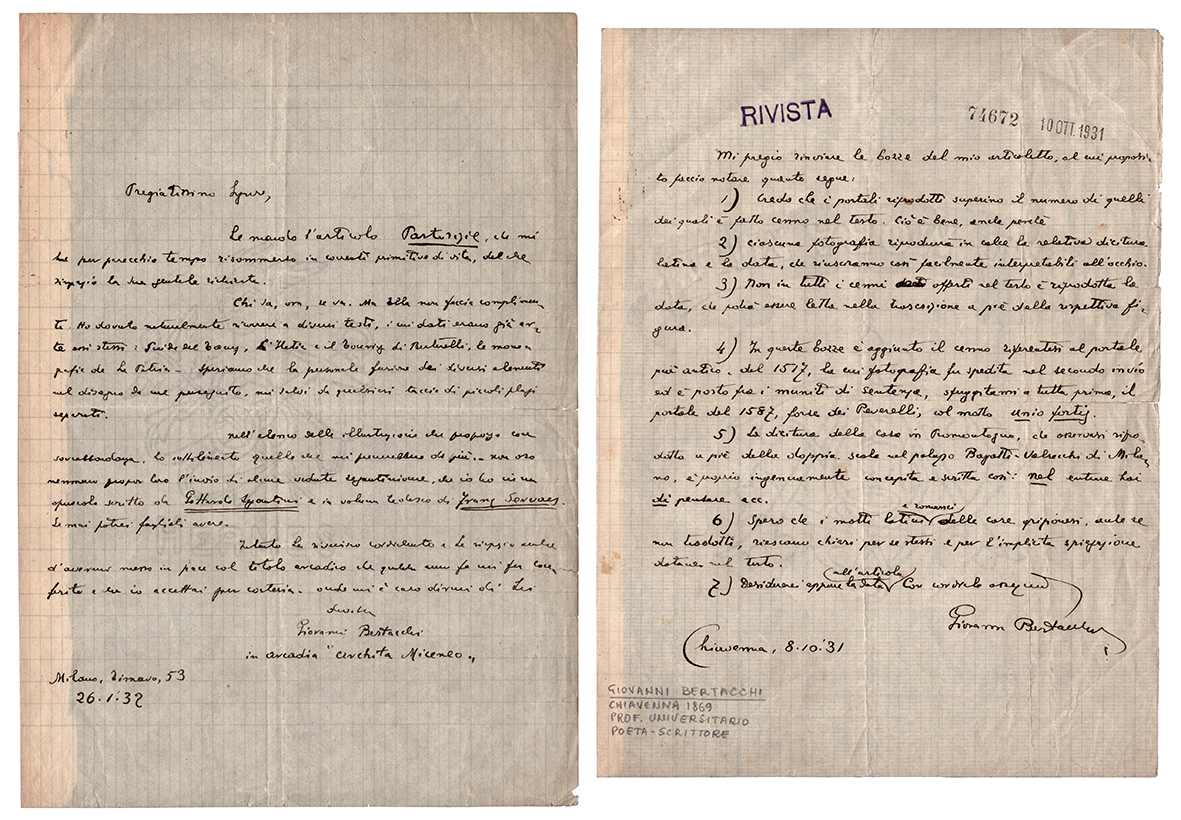 Due lettere autografe firmate del poeta e critico letterario autore del 'Canzoniere delle Alpi' (1895) docente all'università di Padova dal 1916 al 1938. Nella prima missiva, datata 'Chiavenna 8.10.1931', Bertacchi fornisce indicazioni all'editore su come approntare il suo nuovo articolo: "Mi pregio inviare le bozze del mio articoletto, al cui proposito faccio notare quanto segue: 1. Credo che i portali riprodotti superino il numero di quelli dei quali è fatto cenno nel testo. Ciò è bene, anche perché 2. ciascuna fotografia riprodurrà in calce la relativa dicitura latina e la data, che riusciranno così facilmente interpretabili all'occhio...". Una pagina in-4. Nella seconda missiva, datata 'Milano 26.I.1932', Bertacchi scrive: "Le mando l'articolo 'Pastorizie'..." e si firma "Giovanni Bertacchi in arcadia Archita Miceneo", forse in riferimento ad una loggia alla quale può darsi sia appartenuto. Una pagina in-4.