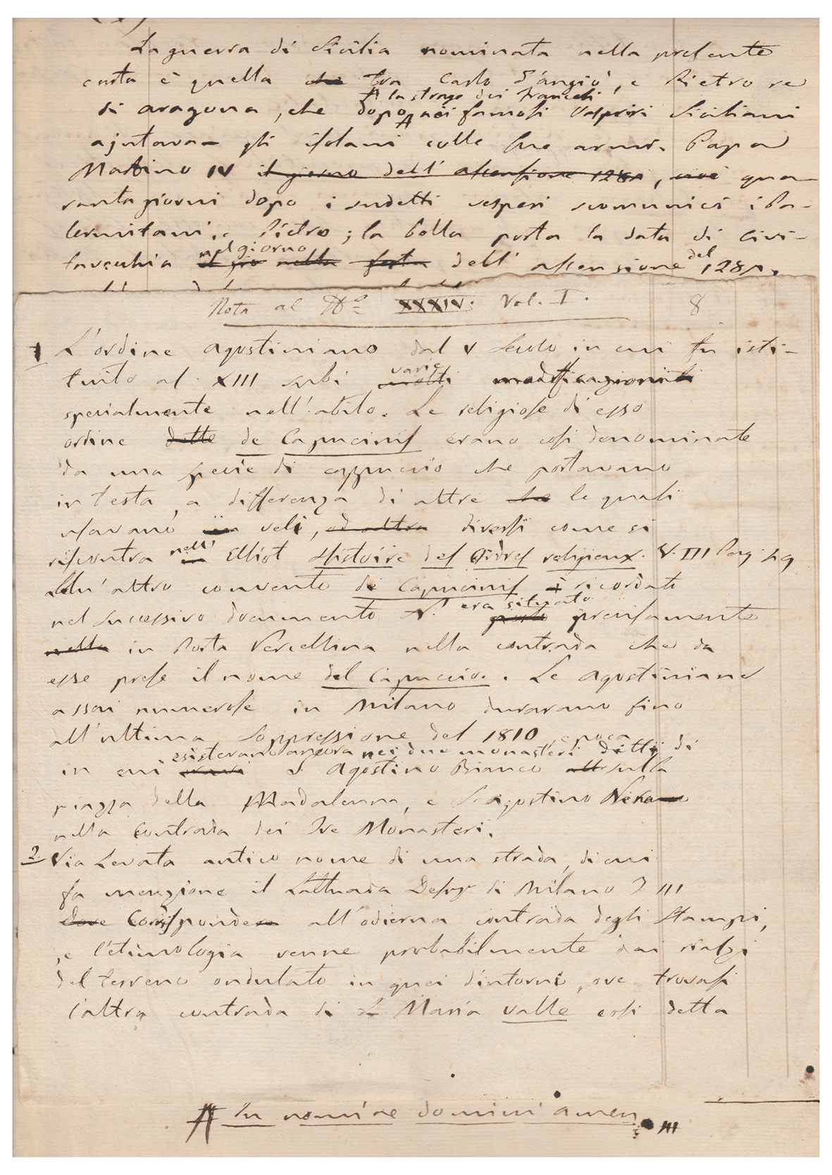 Due carte di lavoro autografe dello storico, noto traduttore di Walter Scott, Francesco Cusani, contenenti note esplicative ad alcuni documenti pubblicati sull’opera “La Sicilia cenni geografico-storici per l’intelligenza della guerra attuale” del 1860. La prima è una "Nota al documento N° XXX Vol I", circa la guerra di Sicilia tra Carlo d'Angiò e Pietro d'Aragona. La seconda, recante il titolo di "Nota al N° XXXIV Vol. I", è relativa alla storia dell'ordine agostiniano. Per un totale di quattro pagine in vario formato (senza indicazione di data, 1860 ca.), dense di cassature e rifacimenti.
