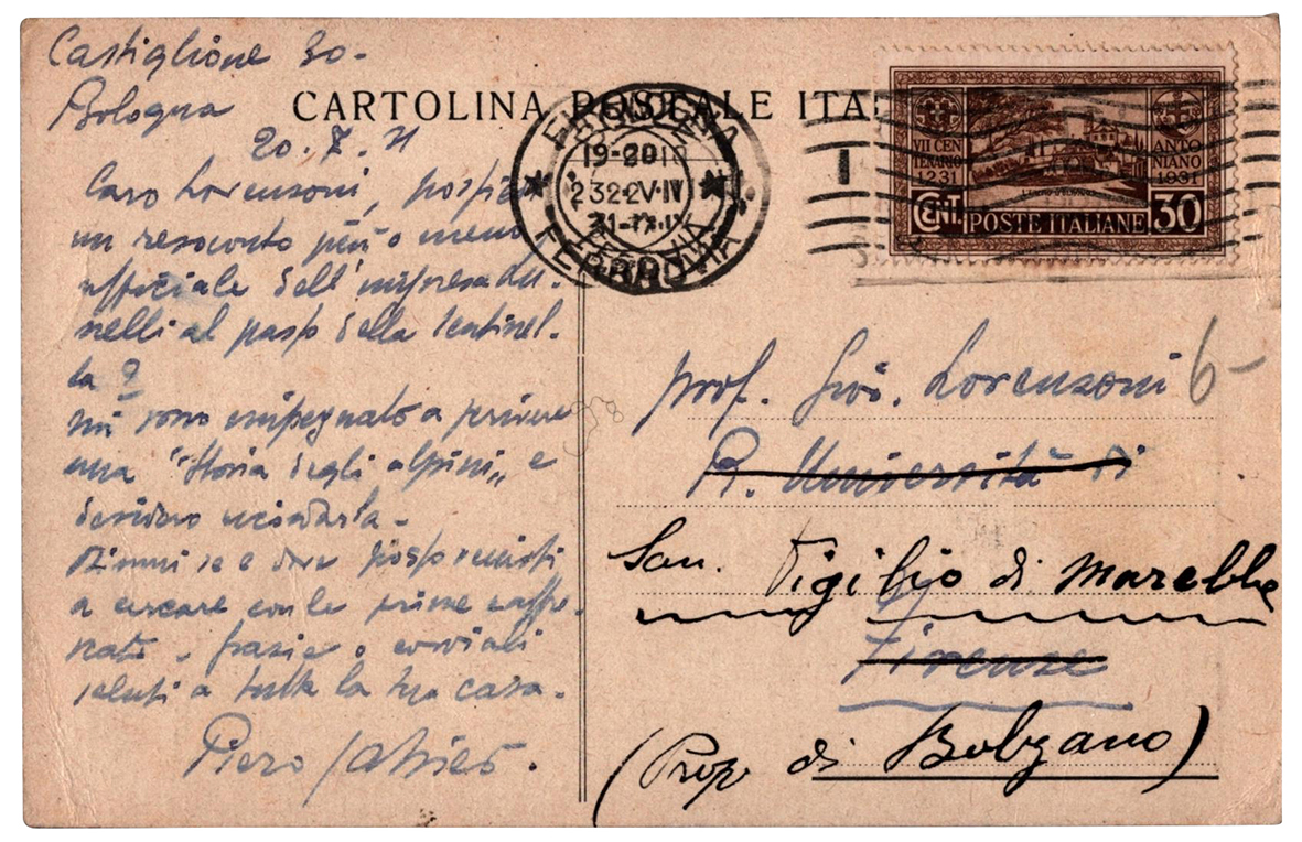 Lettera autografa firmata, su cartolina postale viaggiata illustrata, datata '20.10.1931' del poeta, narratore e traduttore, assiduo collaboratore della rivista 'La Voce', autore di “Ragazzo” (1919) Piero Jahier. Nel 1909 conobbe Giuseppe Prezzolini, iniziò a collaborare alla rivista 'La Voce' della quale divenne responsabile dal 1911 al 1913. Nel 1916 si arruolò come volontario negli Alpini con il grado di sottotenente. Mentre era al fronte divenne ufficiale addetto al 'Servizio P' e curò la pubblicazione del giornale di trincea 'L'Astico'. Nel 1919 uscì a cura di Barba Piero (in genovese "zio Piero"), pseudonimo già da lui usato, la raccolta 'Canti di soldati'che si ispirava al periodo vissuto in trincea. La missiva è diretta a Giovanni Lorenzoni docente di economia politica e celebre alpinista, al quale chiede di inviargli: "un resoconto più o meno ufficiale dell’impresa militare al Passo della Sentinella". "Mi sono impegnato a scrivere una storia degli Alpini e desidero ricordarla...".