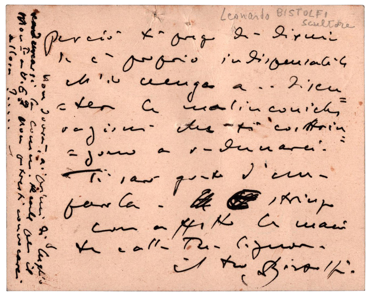 Firma e rigo autografi su cartolina fotografica, raffigurante un'opera di Davide Calandra, del rinomato scultore Leonardo Bistolfi, fra i principali esponenti del simbolismo italiano. La svolta simbolista avvenne con quella che è divenuta una vera icona della nuova sensibilità: il monumento funebre della famiglia Pansa nel cimitero di Cuneo, la cosiddetta Sfinge, elaborata e compiuta tra il 1890 ed il 1892. Nell’ottobre del 1901, grazie a Giovanni Cena, Bistolfi riceve la visita di Rodin, che ammira il 'Crocefisso Brayda' ed il 'Dolore confortato dalle Memorie', il complesso concluso nel 1901 per il monumento Durio a Torino, cui forse si rifersice l'appunto, nel nostro biglietto, alle "malinconiche vergini". Sono anni di grande successo quelli al volgere del nuovo secolo: il 1905 vide il suo trionfo alla VI Esposizione Internazionale di Venezia (in cui era, tra l’altro, membro della Giuria di accettazione), ottenendo una mostra personale, allestita nella Tribuna, con 21 sculture e i disegni per il Funerale della Vergine, e ricevette la Grande Medaglia d’oro per la scultura. Alcuni importanti acquisti (GNAM di Roma, Museo Revoltella di Trieste, Museo Municipale di Venezia, Museo Civico di Torino), coronarono il successo nazionale.