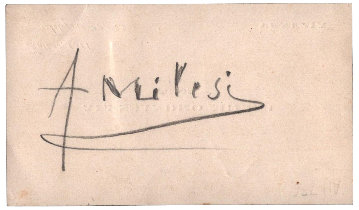 Firma autografa su biglietto da visita del pittore veneto autore de 'La partenza del marinaio' (1901).