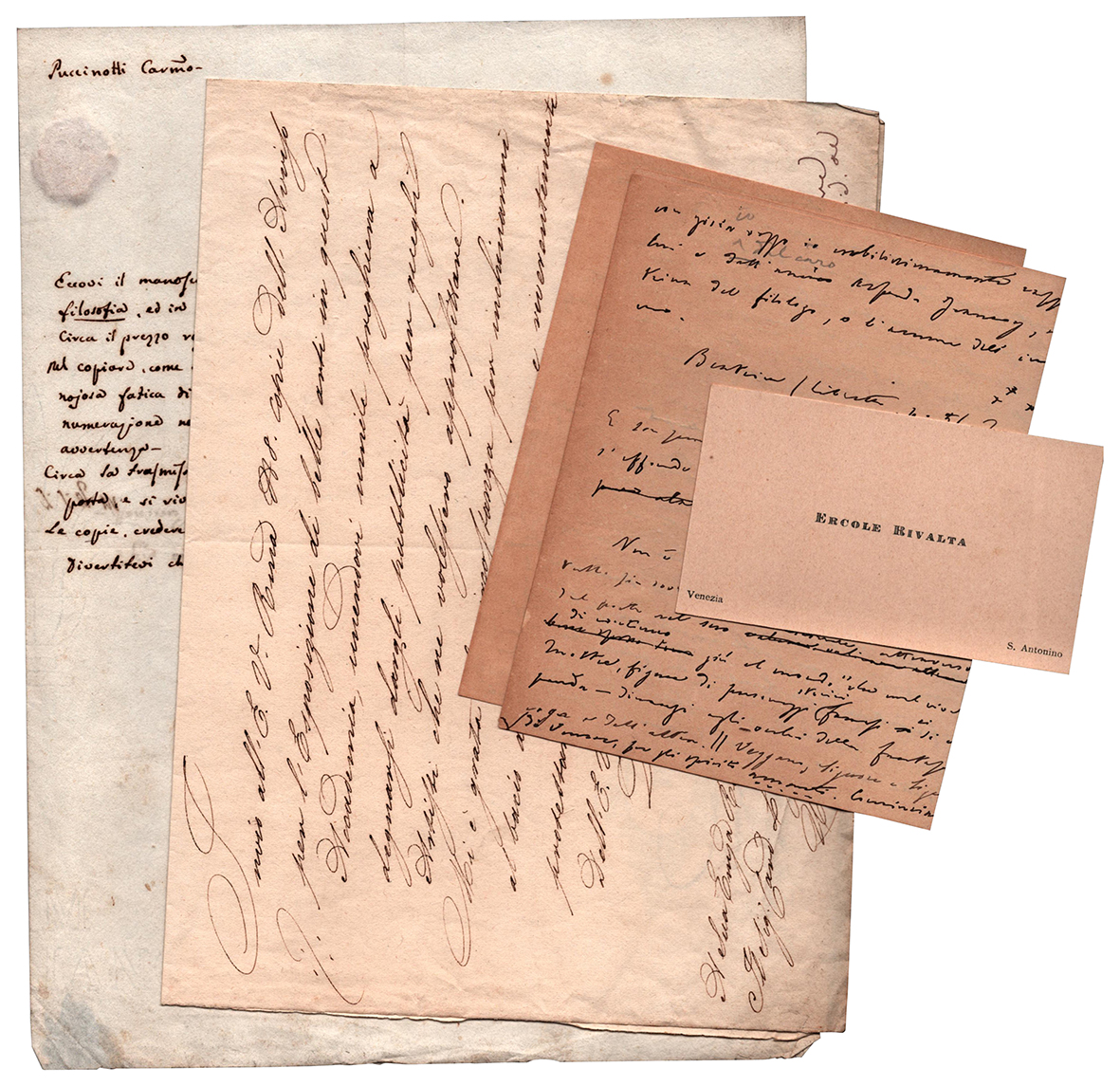 Due lettere firmate del noto storico dell'arte maceratese. La prima (integralmente autografa), datata 'Di Casa 20 feb. 1827' diretta a Francesco Puccinotti, circa alcune indicazioni editoriali relative ad volume che intende pubblicare: "Eccovi il manoscritto, che favorirete mandare a Nobili, onde lo stampi in caratteri filosofia, ed in testo 8°. Raccomandategli, più che ogn'altra cosa la correzione. Circa il prezzo regolatevi come fosse cosa vostra...". Nel 1824-1825 Ricci ricoprì la carica di gonfaloniere di Macerata e in tale veste convinse Francesco Puccinotti, che sarebbe poi diventato uno dei più famosi medici legali d'Italia, a concorrere per una cattedra di patologia, semeiotica e terapeutica generale. Una pagina in-8. Indirizzo autografo e sigillo ceralacca rossa. La seconda, datata 'Bologna 30 maggio 1846', diretta al Cardinal Legato di Urbino e Pesaro: "Invio all'E.V. Rma. N. 8 copie dell'Avviso per l'Esposizione di belle arti in quest'Accademia...". Una pagina in-8, carta intestata 'Accademia Pontificia di Belle Arti'. Timbro di appartenenza. Rinomato storico dell'arte, presidente dell'Accademia Pontificia di Belle Arti di Bologna, fu autore di alcune significative opere, tra le quali si ricordano Memorie storiche delle arti e degli artisti della Marca di Ancona (Macerata, 1834) e Storia dell'architettura in Italia dal secolo IV al XVIII (Modena, 1857-1859). E' accluso un biglietto da visita di Ercole Rivalta.