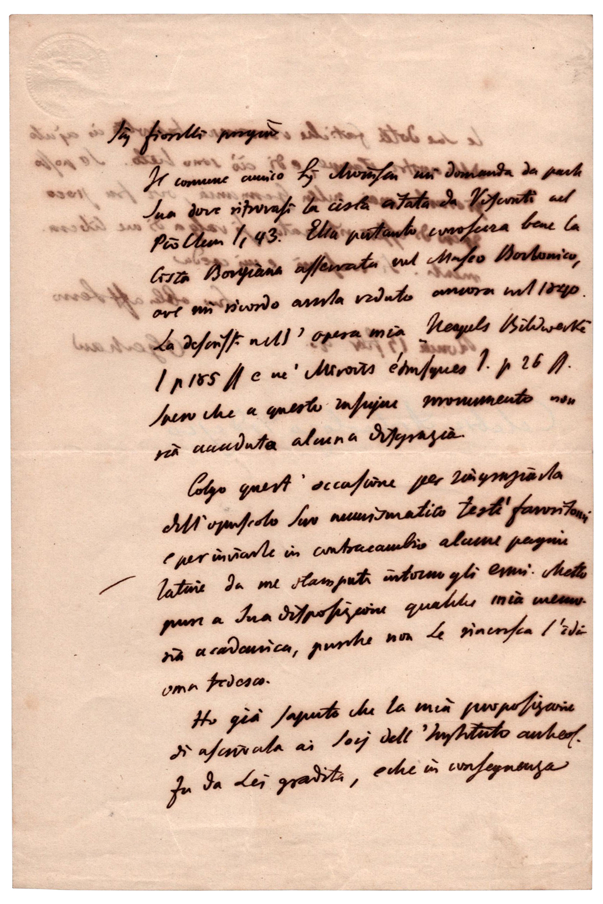 Illustre archeologo, co-fondatore e segretario della prima società internazionale di archeologia, visse a Roma e in altre città italiane (1822-37); profondo conoscitore di ogni ramo dell'archeologia classica, si dedicò specialmente agli studi di mitologia, pubblicando due volumi sull'argomento (1854-55), e a quelli di topografia romana, considerando i monumenti in quanto fonte per la ricostruzione e conoscenza della cultura antica. Fondò in Roma (1829) l'Istituto di corrispondenza archeologica, che poi (1871) si trasformò in Istituto archeologico germanico. Promosse la pubblicazione di grandi raccolte di varie classi di monumenti figurati, come i 4 volumi sugli specchi etruschi (1843-68) e i 4 su vasi in gran parte di provenienza etrusca (1840-58). Interessante lettera autografa firmata, datata "Roma 13 febbraio 1846" diretta al celebre archeologo e numismatico Giuseppe Fiorelli (1823-1896), noto per essere stato l'ideatore della tecnica dei calchi dei cadaveri di Pompei. Nella prima parte della missiva lo prega di fornirgli alcune notizie intorno alla "cista Borgiana osservata nel Museo Borbonico, ove mi ricordo averla veduta ancora nel 1840. La descrissi nell'opera mia Neapels Bildwerke (p. 185) e ne' Miroirs étrusques (p. 26). Spero che a questo insigne monumento non sia accaduta alcuna disgrazia...". In seguito ringrazia "dell'opuscolo Suo numismatico testé fornitomi...". Chiude esprimendo soddisfazione circa l'accettazione del giovane collega di entrare a far parte dell'istituto archeologico. "in conseguenza le sue dotte fatiche verranno talvolta in ajuto delle nostre stampe...". Due pagine in-8, su bifolio.
