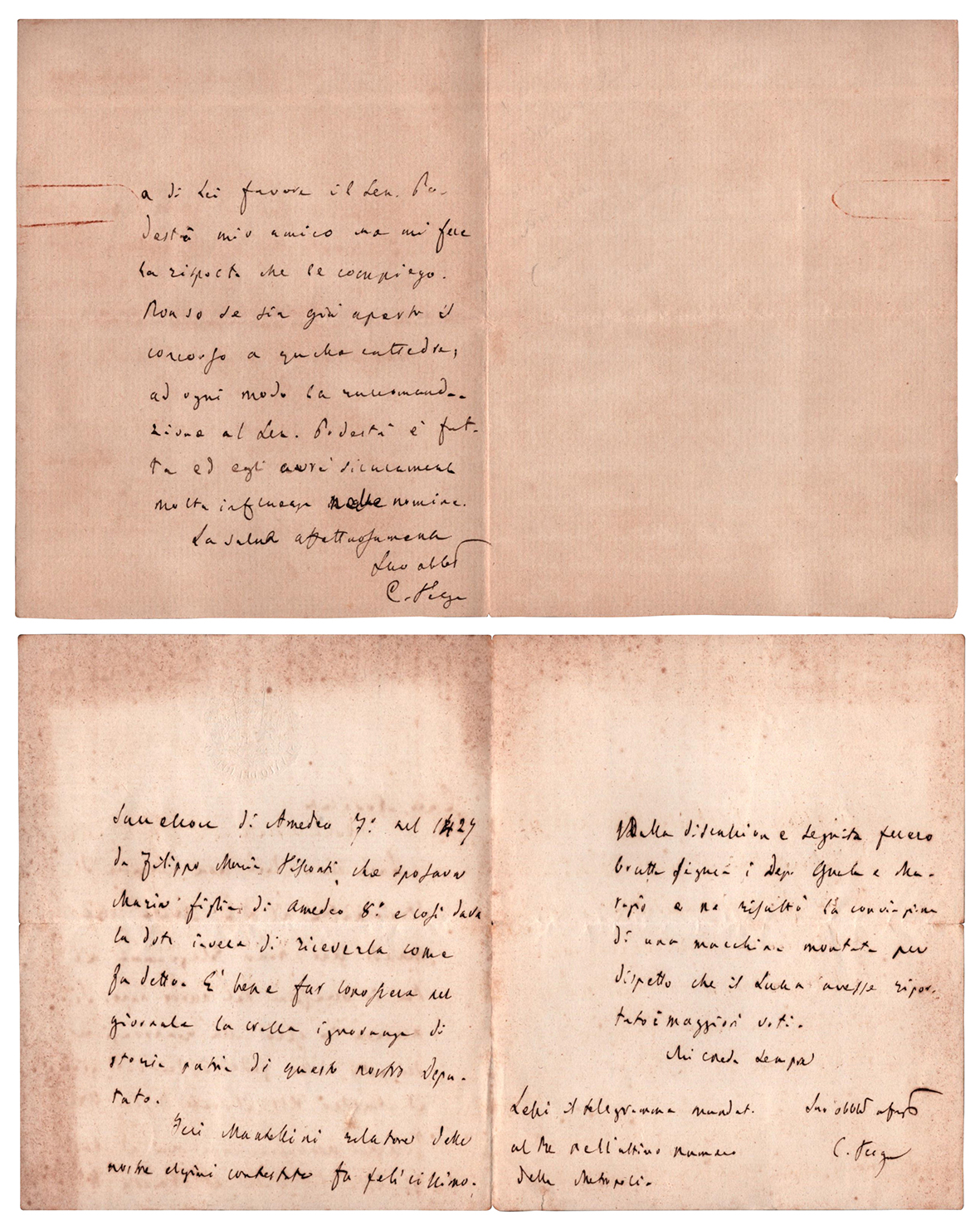Due lettere autografe firmate dell'uomo politico, prefetto delle province di Como, Reggio, Parma e commissario straordinario in Lunigiana durante la seconda guerra d'indipendenza. La prima, datata 'Roma 18 gen, 1887', verte su una questione storiografica riguardante la dinastia sabauda e il Deputato Luigi Guala, politico e senatore del Regno d'Italia nella XVII legislatura:"Sarà bene dare una lezione di storia patria al Dep. Guala che mandò uno strano telegramma al Re in occasione del nuovo anno. Si accenna in esso alla rinnovazione dei patti, della fede e dei voti giurati ad Amedeo VII il Conte Rosso. Ora perché non appartenne mai ad Amedeo 7° essa fu ceduta ad Amedeo 8° successore di Amedeo 7° nel 1427 da Filippo Maria Visconti che sposava Maria figlia di Amedeo 8° e così dava la dote invece di riceverla come fu detto...". Tre pagine in-16, carta intestata 'Senato del Regno’. Nella seconda , datata 'Vercelli 29 agosto 1884', scrive al corrispondente di averlo segnalato per un concorso scolastico ad Andrea Podestà, nominato Senatore nel 1883: "Non so se sia già aperto il concorso a qualche cattedra, ad ogni modo la raccomandazione al Sen. Podestà è fatta ed egli avrà sicuramente molta influenza nelle nomine...".