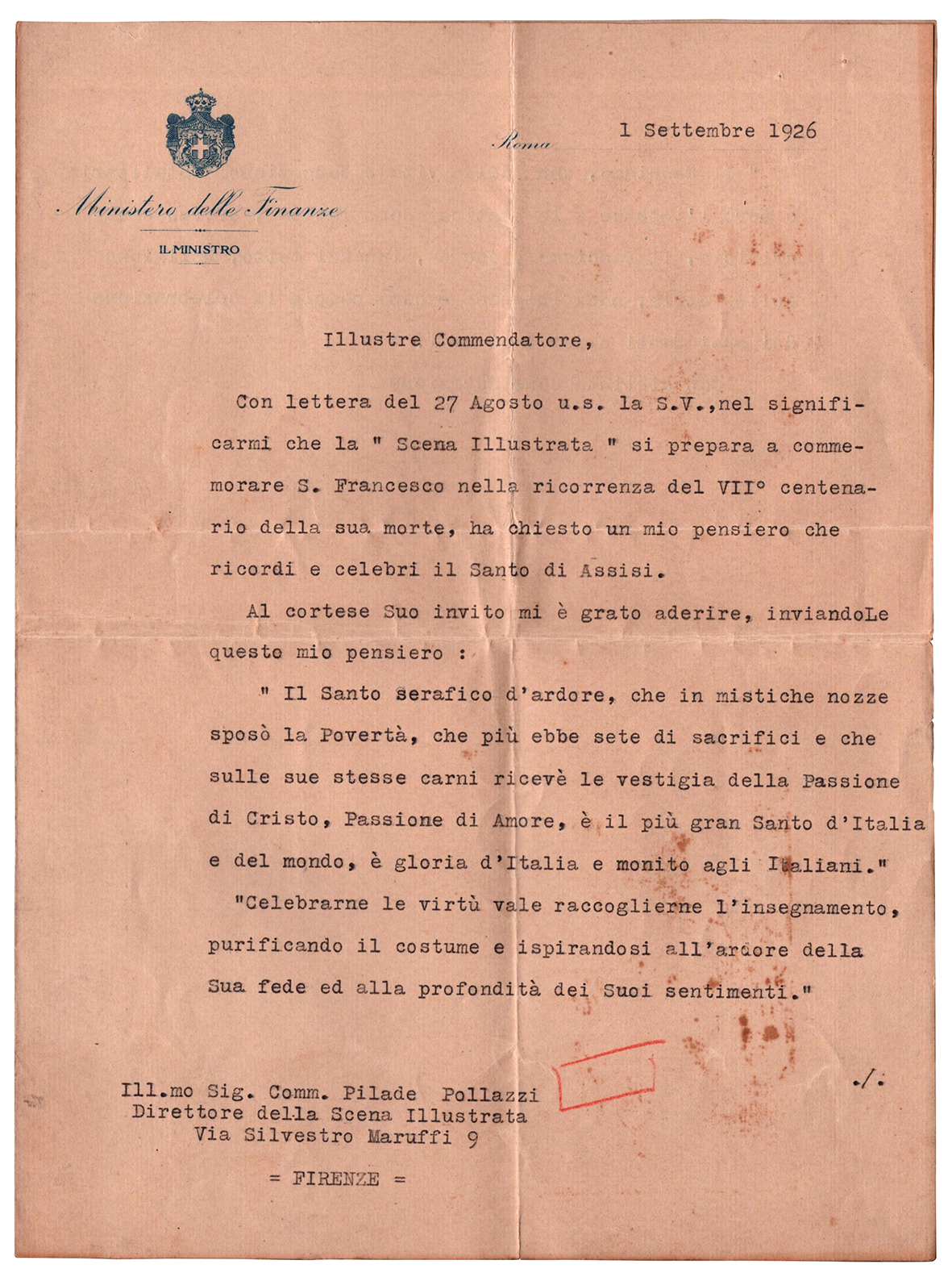 Lettera dattiloscritta con firma autografa, datata 'Roma 1 settembre 1926' del Governatore della Tripolitania, Ministro delle finanze del Regno d'Italia e Presidente di Confindustria dal 1934 al 1943, Giuseppe Volpi di Misurata. La missiva è diretta a Pilade Pollazzi (1852-1940) direttore della 'Scena Illustrata', in occasione dei settecento anni della morte di San Francesco d'Assisi: "...ha chiesto un mio pensiero che ricordi e celebri il Santo di Assisi. Al cortese suo invito mi è grato aderire, inviandole questo mio pensiero: Il Santo serafico d'ardore, che in mistiche nozze sposò la Povertà, che più ebbe sete di sacrifici e che sulle sue stesse carni ricevè le vestigia della Passione di Cristo, Passione di Amore, è il più gran Santo d'Italia e del mondo, è gloria d'Italia e monito agli Italiani...". Una pagina e 1/2 in-8, su carta intestata 'Ministero delle Finanze - Il Ministro'.