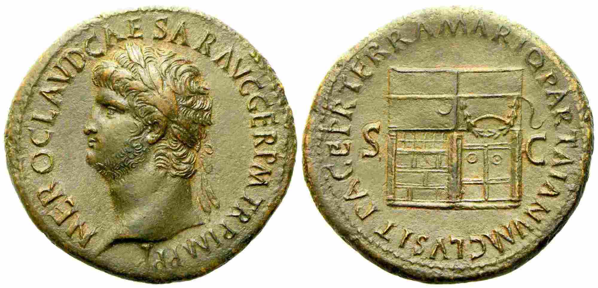 Nero (54-68), Sestertius, Rome, c. AD 65; Æ (g 21,37; mm 35); NERO CLAVD CAESAR AVG GER P M TR P IMP P P, laureate head l., Rv. PACE P R TERRA MARIQ PARTA IANVM CLVSIT, view of the Temple of Janus, decorated with garlands and with the door closed; in field S - C. RIC 265. Beautiful portrait; brown tone; good extremely fine / about Fdc.