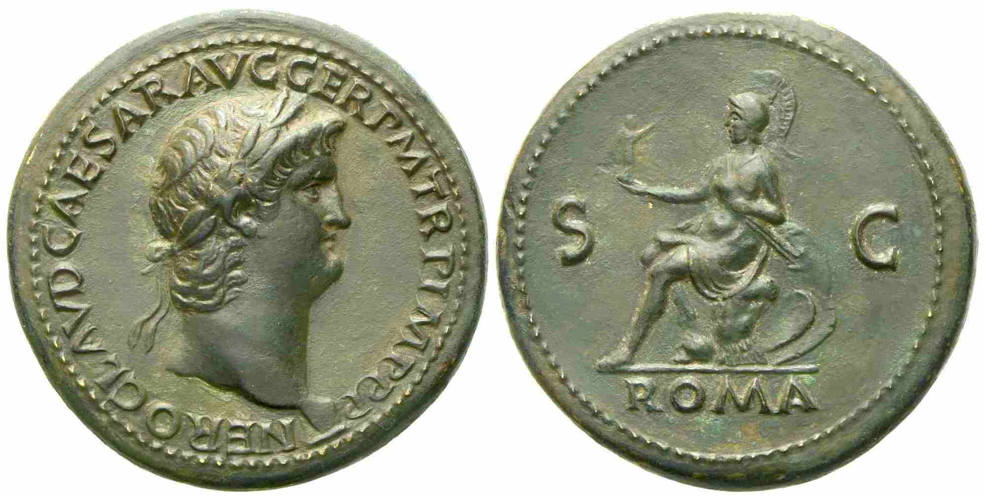 Nero (54-68), Sestertius, Rome, c. AD 65; Æ (g 28,26; mm 35); NERO CLAVD CAESAR AV - G GER P M TR P IMP P P, laureate head r., Rv. Roma, helmeted and in military dress, seated l. on cuirass, holding Victory and resting on parazonium; around and behind, various shields; in field, S - C; in ex. ROMA. RIC 273. Gently smoothed; otherwise good extremely fine.