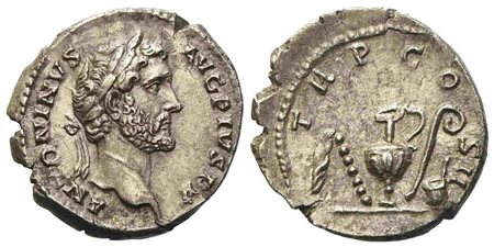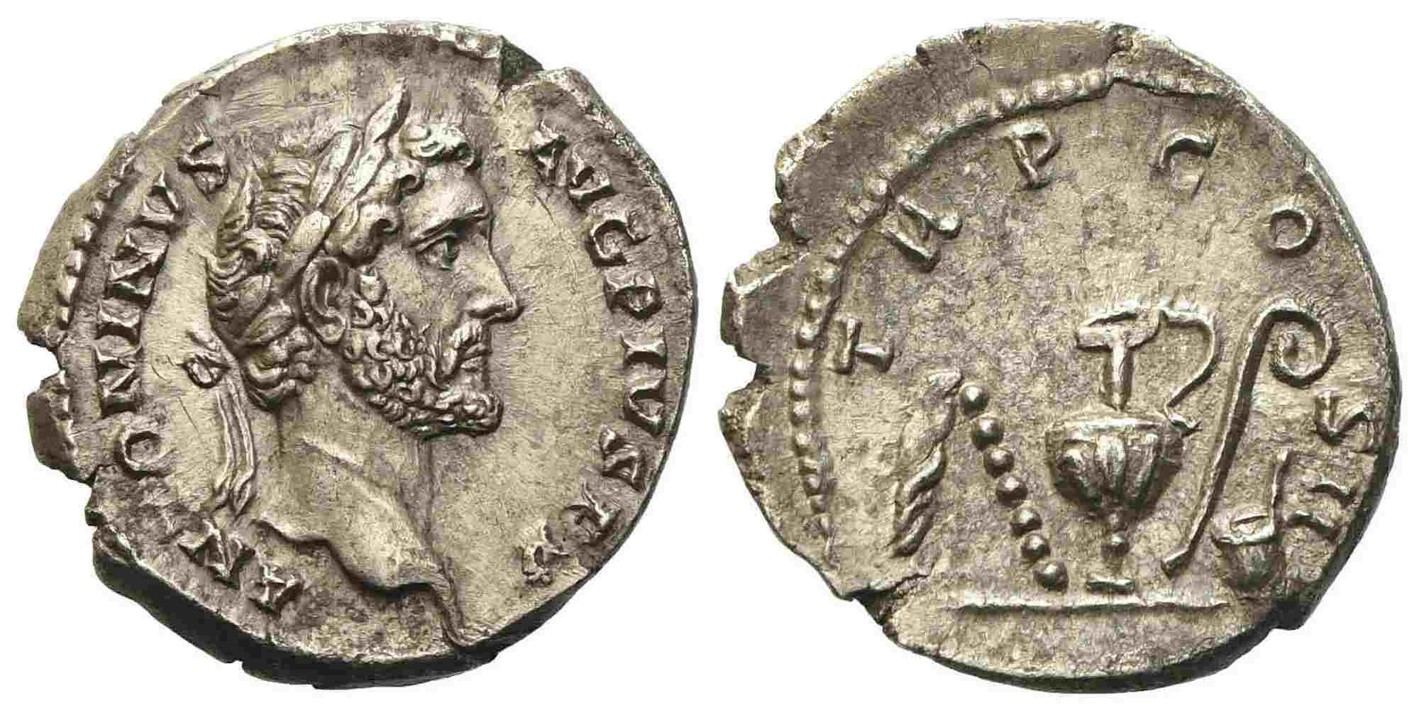 Antoninus Pius (138-161), Denarius, Rome, AD 139; AR (g 3,43; mm 17,5); ANTONINVS AVG PIVS PP, laureate head r., Rv. TR P COS II, sprinkler, jug, lituus and simpulum. RIC 45 var; C 835. Good extremely fine / about Fdc.