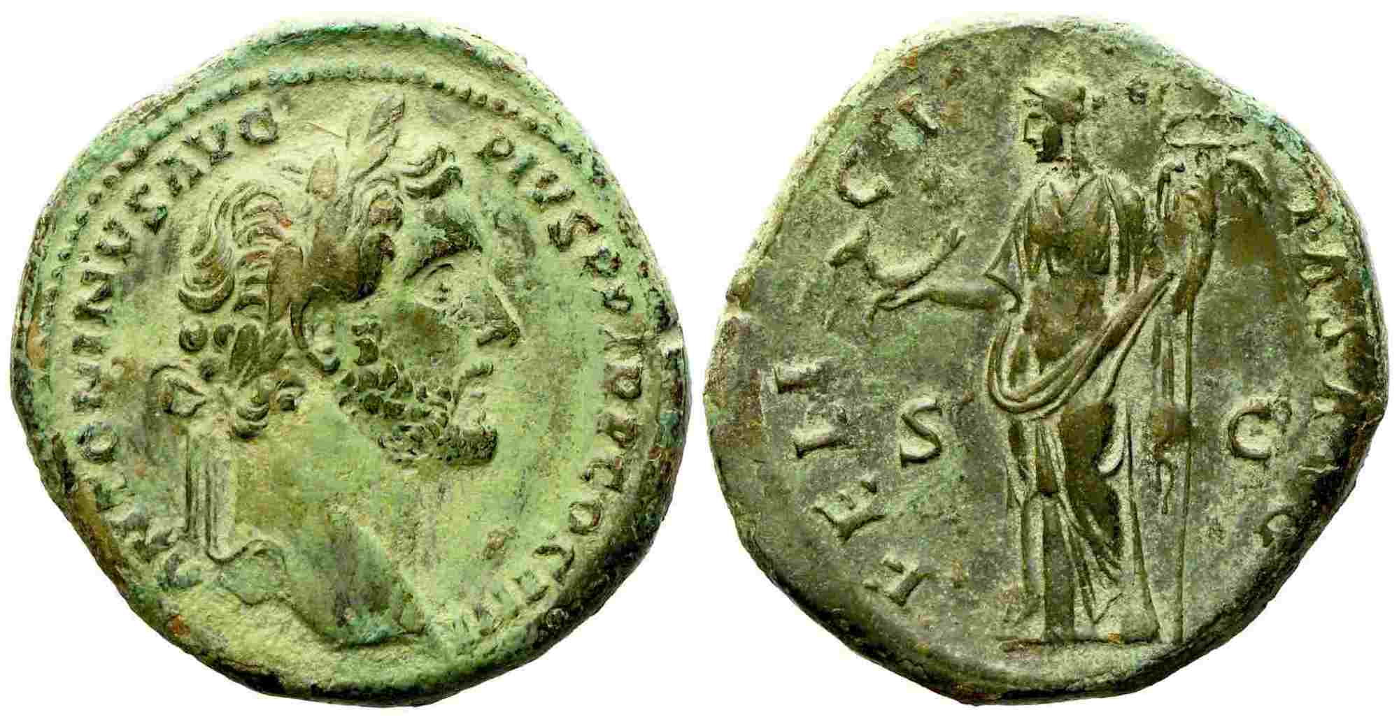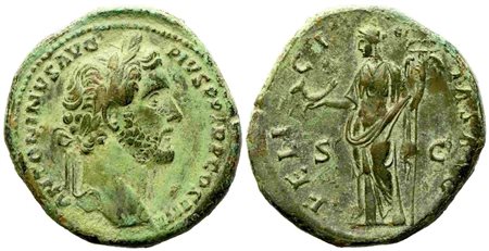 Antoninus Pius (138-161), Sestertius, Rome, AD 145-161; Æ (g 31,09; mm 33); ANTONINVS AVG - PIVS P P TR P COS IIII, laureate head r., Rv. FELI - CI - TAS AVG, Felicitas standing l., holding long caduceus and capricorn; in field, S - C. RIC 770; C 363. Untouched green patina; expressive portrait; about extremely fine.