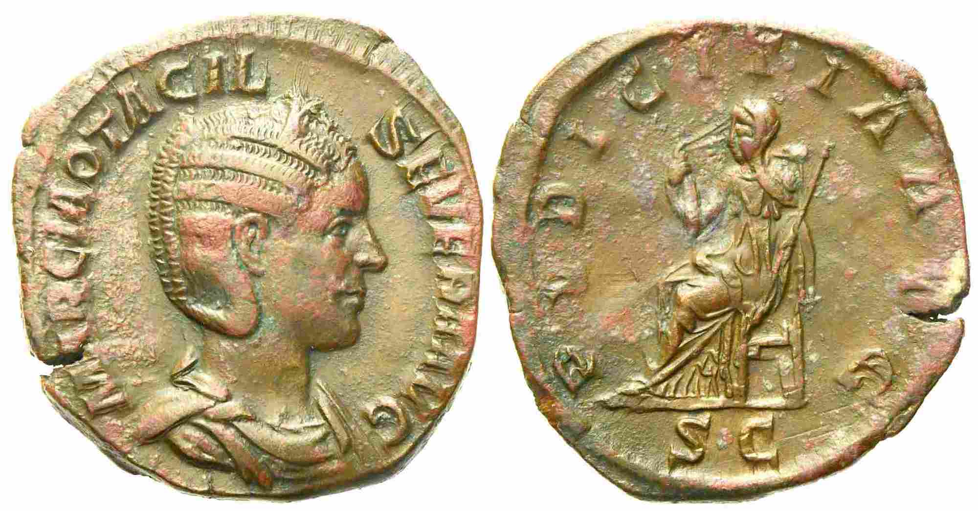Otacilia Severa, Sestertius struck under Philip I, Rome, AD 244-249; Æ (g 20,77; mm 29); MARCIA OTACIL SEVERA AVG, diademed and draped bust r., Rv. PVDICITIA AVG, Pudicitia seated l., holding sceptre and drawing veil from head; in ex. S C. RIC 209a; C 55. Untouched brownish patina with red hues; expressive portrait; extremely fine.