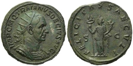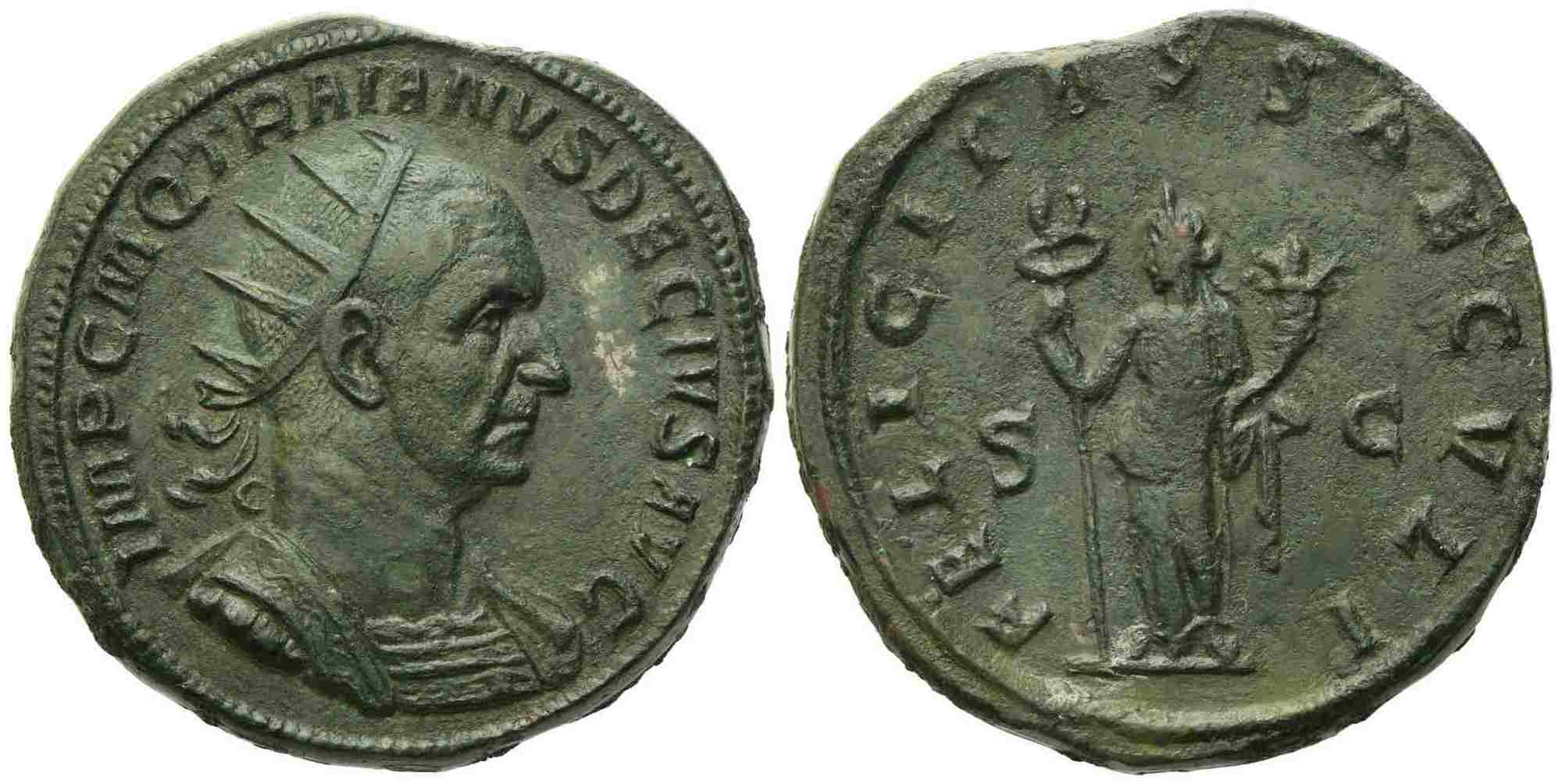 Trajan Decius (249-251), Double Sestertius, Rome, AD 249-251; Æ (g 42,45; mm 36); IMP C M Q TRAIANVS DECIVS AVG, radiate and cuirassed bust r., Rv. FELICITAS SAECVLI, Felicitas standing l., holding long caduceus and cornucopia; in field, S - C. RIC 115a; C 39. Dark green patina; large flan; bold portrait; good extremely fine / about extremely fine.