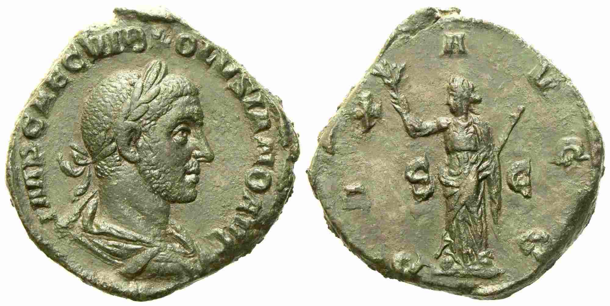 Volusian (251-253), Sestertius, Rome, AD 251-253; Æ (g 23,00; mm 30); IMP CAE C VIB VOLVSIANO AVG, laureate, draped and cuirassed bust r., Rv. PAX - AVGG, Pax standing l., holding branch and transverse sceptre; in field, S - C. RIC 256a; C 74. Dark green patina; nice portrait; good extremely fine.