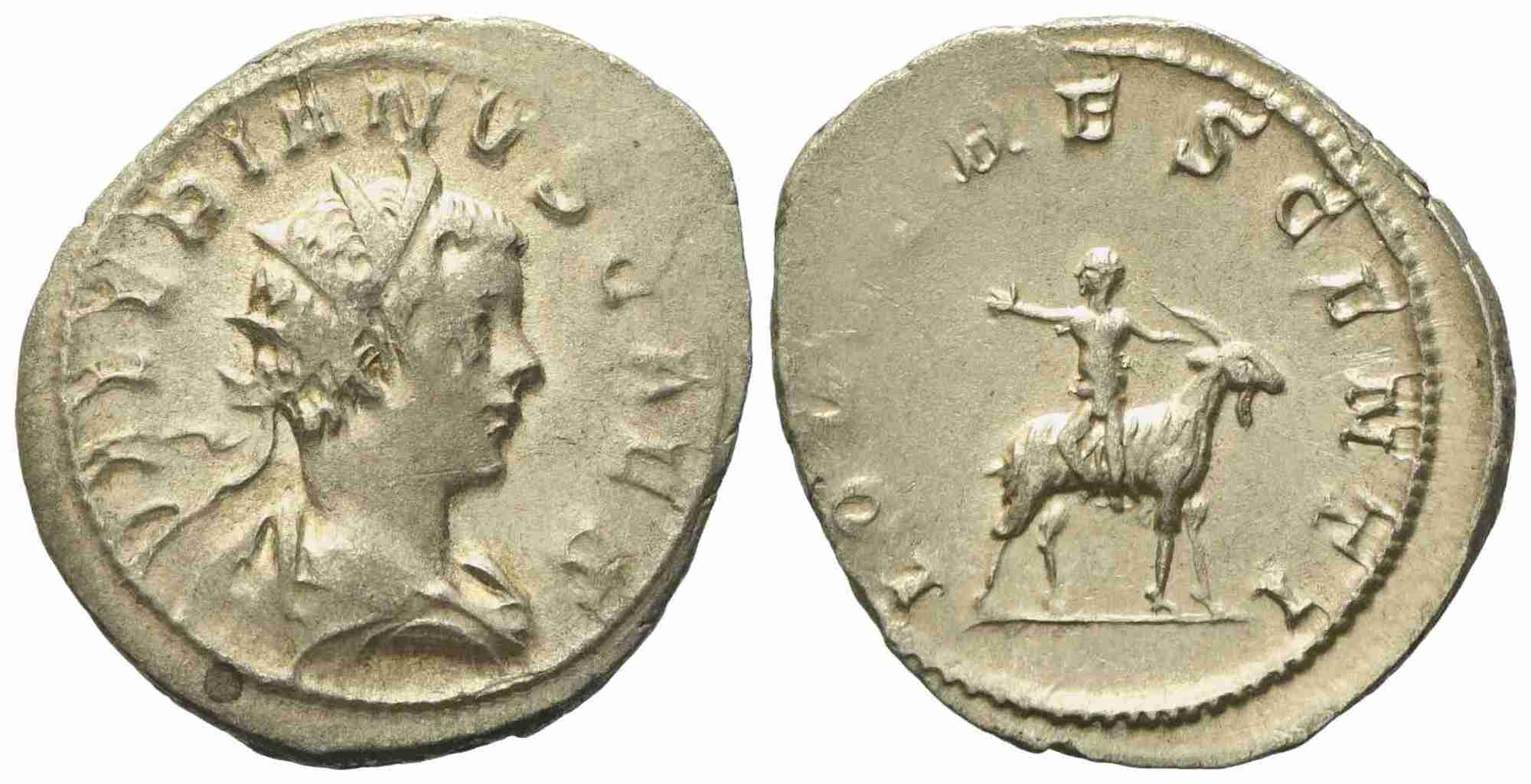 Valerian II Caesar, Antoninianus struck under Gallienus, Colonia Agrippinensium, AD 256; AR (g 3,55; mm 23,8); VALERIANVS CAES, radiate, draped bust r., Rv. IOVI CRESCENTI, infant Jupiter riding goat to r. RIC 3; C 26. About extremely fine.