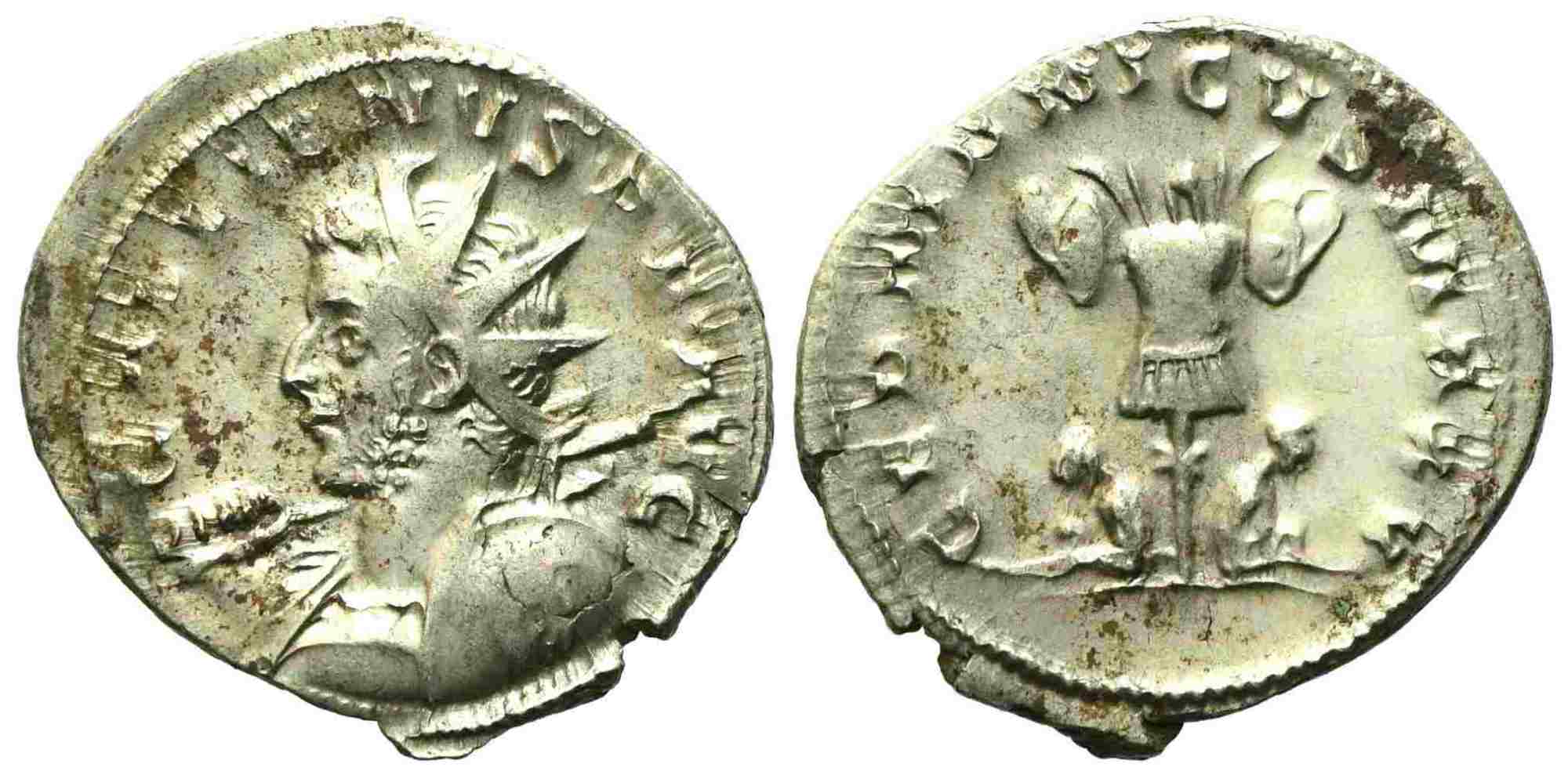 Gallienus (253-269), Antoninianus, Lugdunum, AD 258-259; BI (g 3,60; mm 22,7); Lugdunum, AD 258-9. GALLIENVS dot P dot F dot AVG, radiate, cuirassed bust left, holding spear and shield, Rv. GERMANICVS MAX V, two German captives bound and seated at the foot of a trophy. RIC 18; C 310. Good extremely fine / about Fdc.