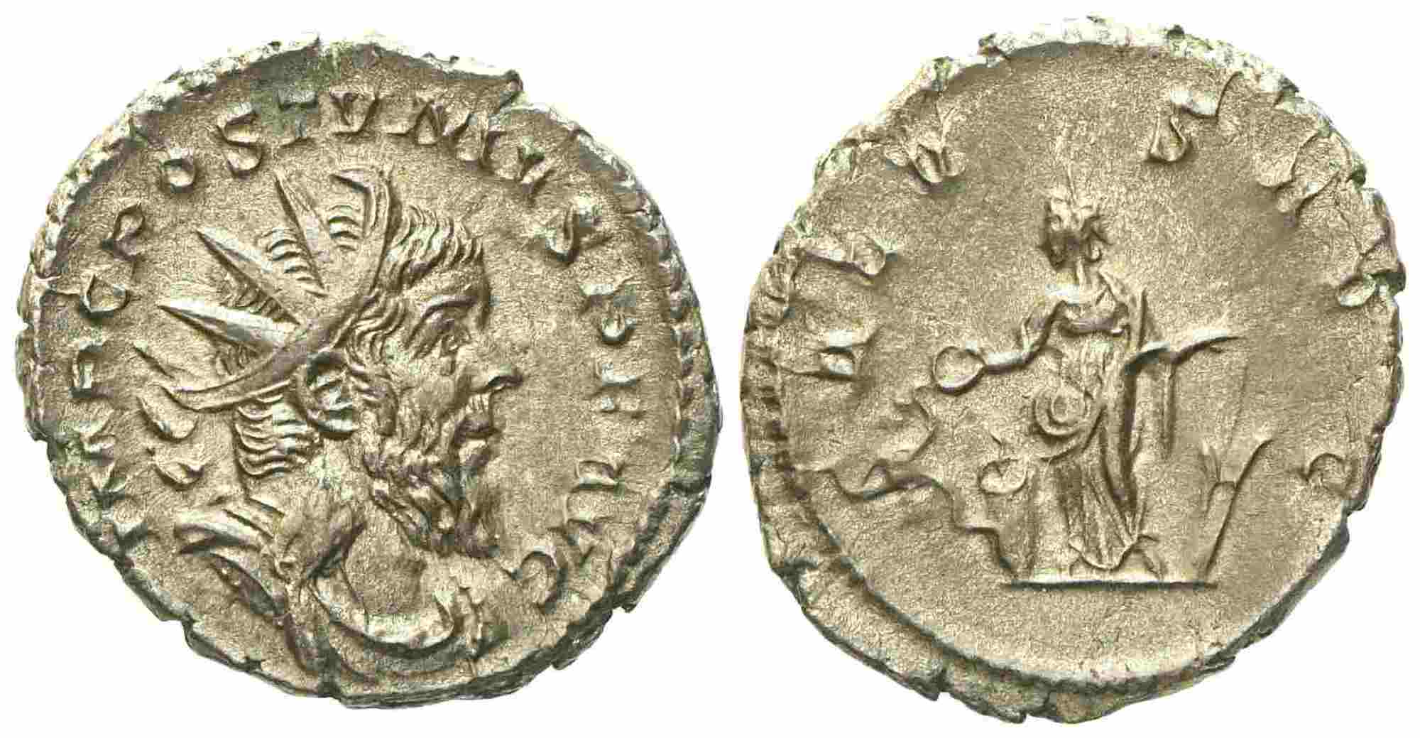 Postumus (Imperium Galliarum, 260-269), Antoninianus, Cologne, AD 262; BI (g 4,14; mm 22,4); IMP C POSTVMVS P F AVG, radiate, draped and cuirassed bust r., Rv. SALVS AVG, Salus standing l., holding patera in right hand from which a snake, which is rising from small altar placed on ground to left, is feeding; in her left hand Salus holds a rudder. RIC 85; C339. Good extremely fine.