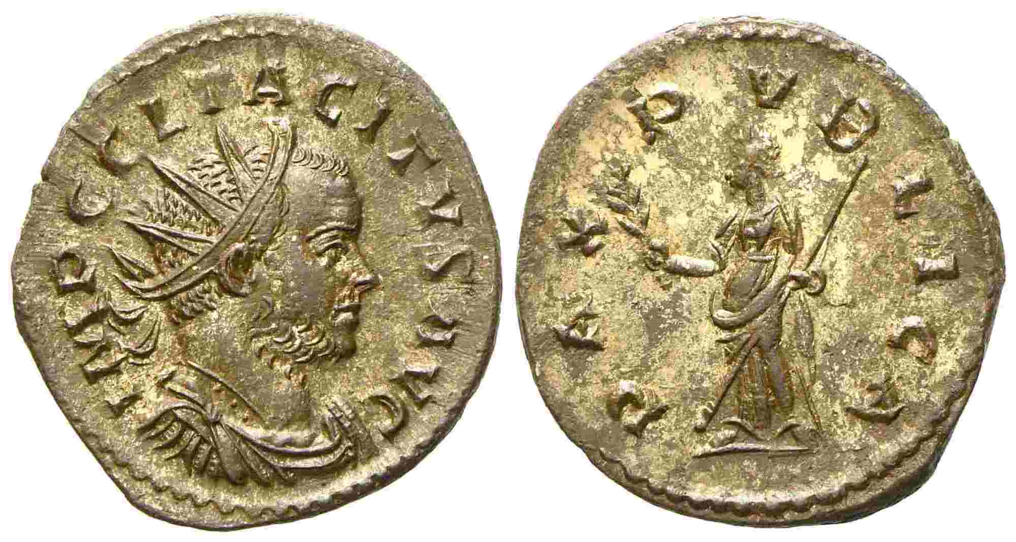 Tacitus (275-276), Antoninianus, Lugdunum, undated; Æ silvered (g 3,75; mm 21,9); IMP C CL TACITVS AVG radiate, draped, and cuirassed bust r., Rv. PAX PVBLICA, Pax standing l., holding branch and transverse sceptre. RIC 45; C 83. Good extremely fine.