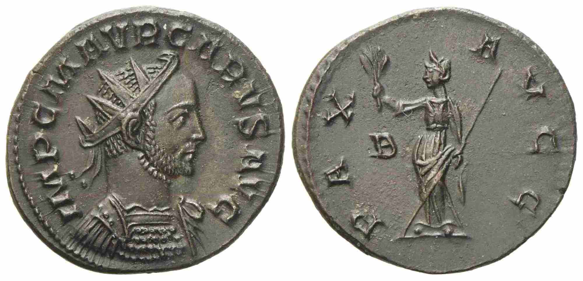 Carus (282-283), Antoninianus, Lugdunum, 2nd emission, October AD 282; Æ silvered (g 3,95; mm 21,9); Rome. IMP C M AVR CARVS AVG, radiate and cuirassed bust r., Rv. PAX AVGG, Pax standing front, head to left, holding branch in her right hand and long transverse sceptre with her left; B in the left field. RIC 13; C 48. Good extremely fine / about Fdc.