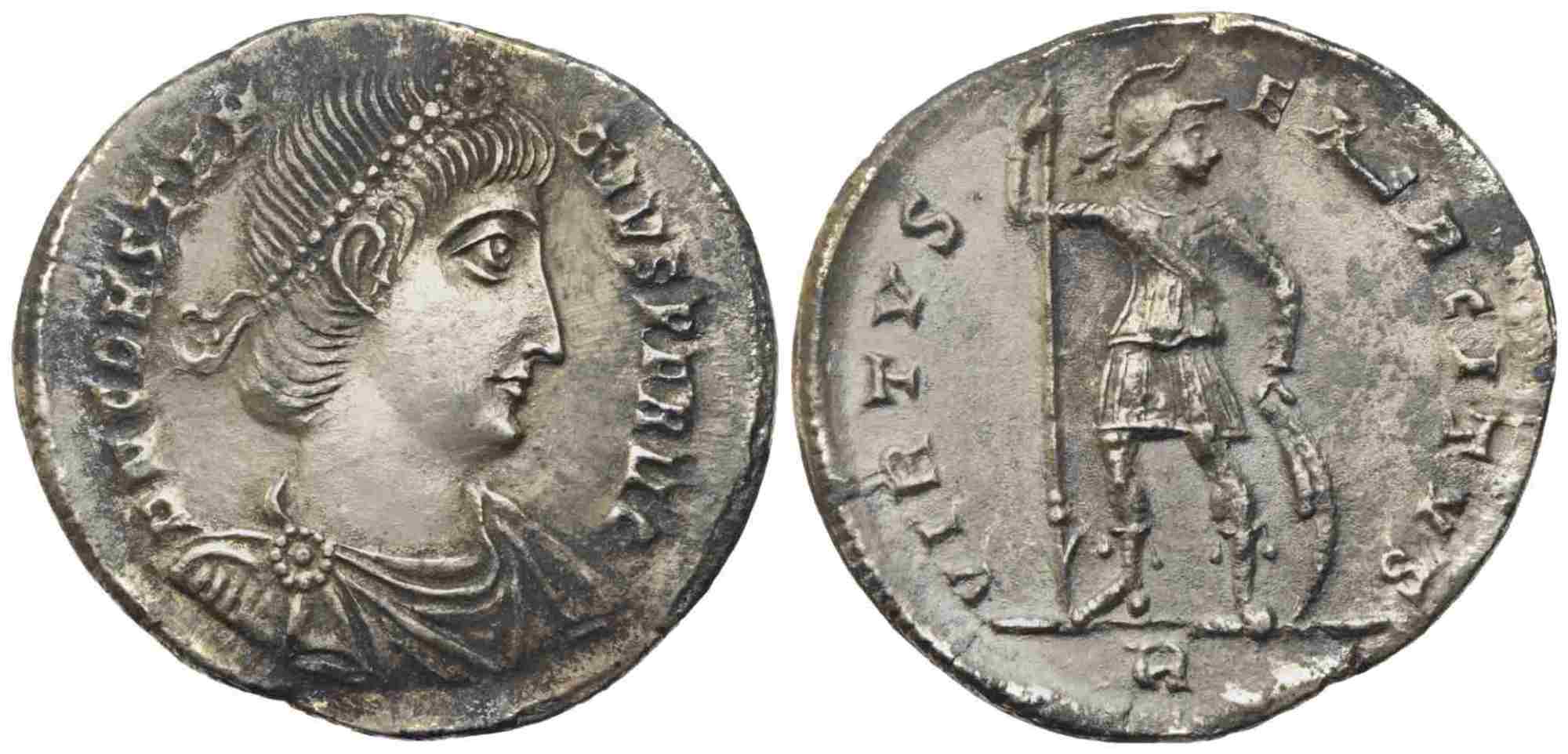Constantius II (337-361), Light Miliarense, Rome, AD 352-354. AR (g 4; mm 23); DN CONSTANTVS P F AVG, diademed, draped and cuirassed bust r., Rv. VIRTVS EXERCITVS, soldier standing facing, head r., with inverted spear and resting hand on shield. Mintmark R in ex. RIC 238; C 326. Good extremely fine.