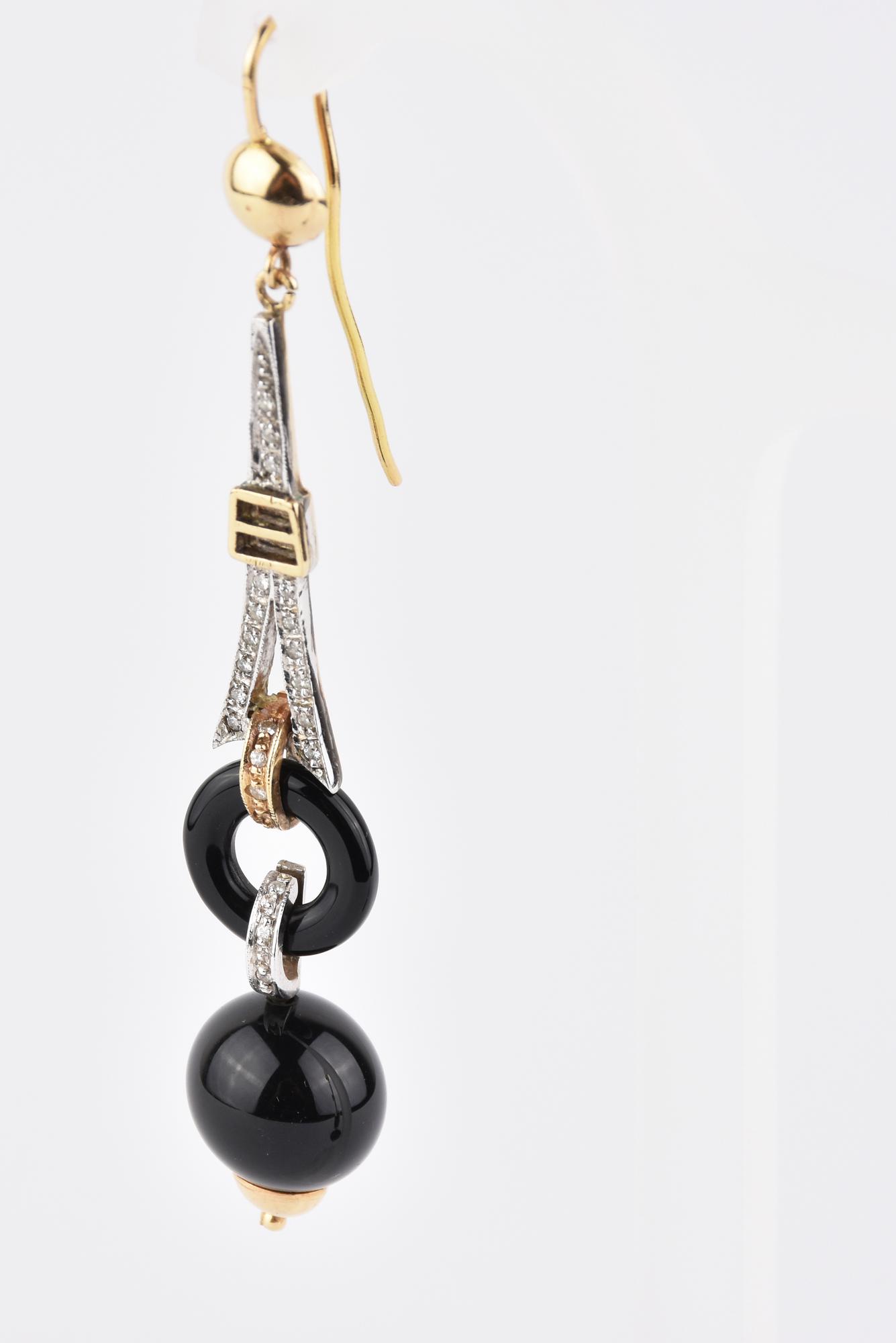 orecchini con struttura ad ago in oro bianco e giallo impreziositi da piccoli brillanti e onice