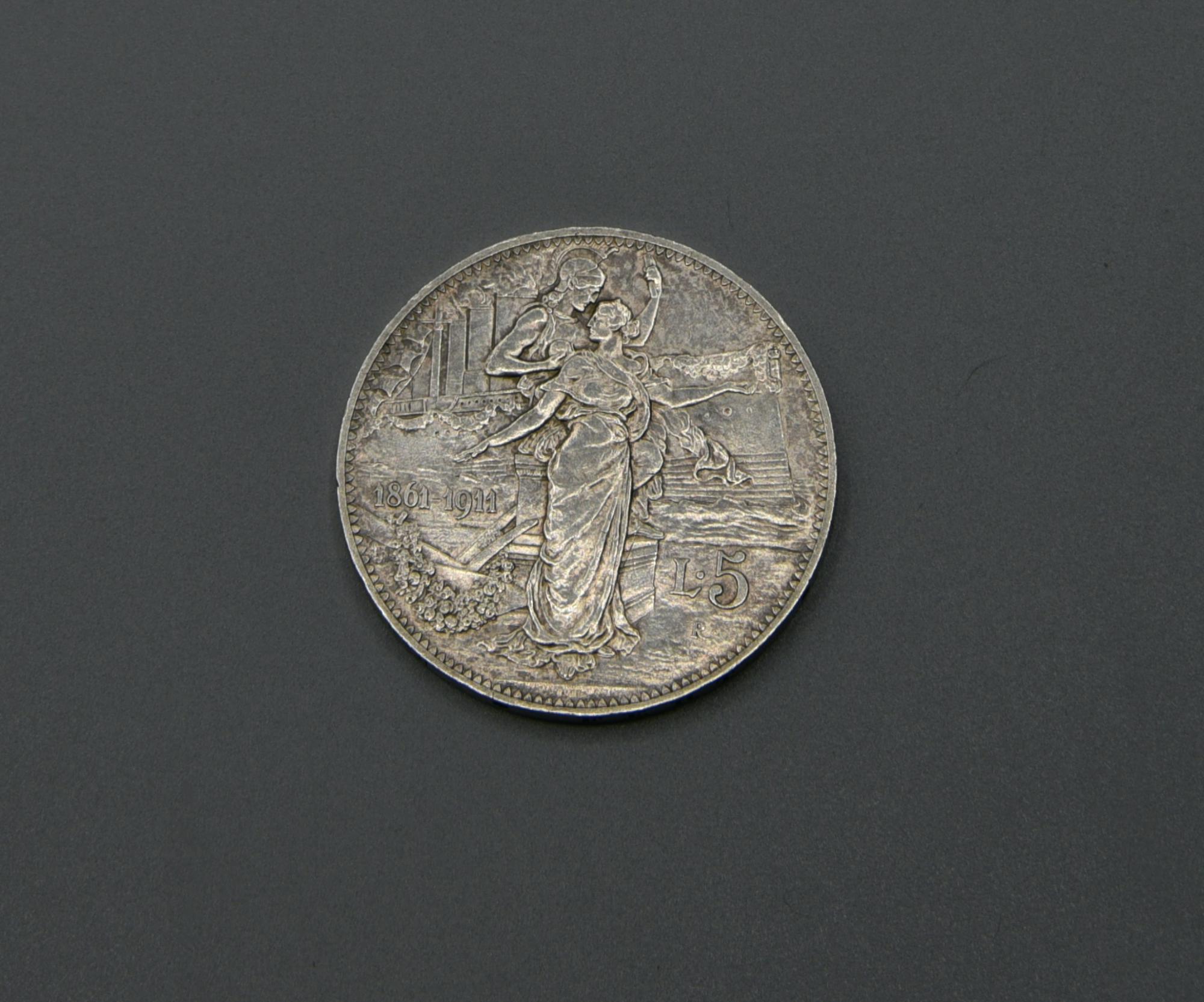 Verso: rappresentazione allegorica dell'Italia presso il monumento simboleggiante la citta' di Roma. Sullo sfondo una nave da guerra a vapore, a prua festoni e scudo sabaudo. A sinistra un aratro ornato con una ghirlanda di fiori a cui sono sovrapposte le date 1861-1911. A destra l'indicazione del valore e sotto l'iniziale del luogo in cui fu coniata, Roma