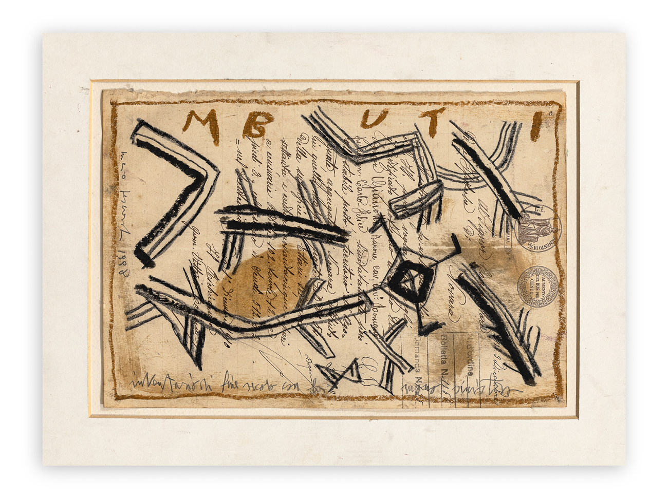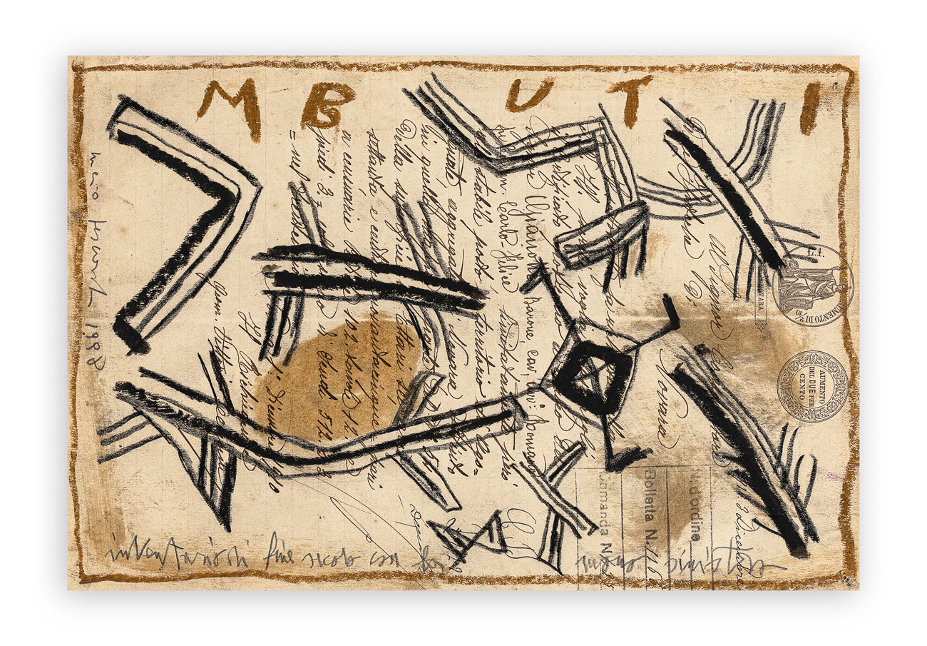 Opera facente parte del ciclo 'Inventario di fine secolo': un lavoro a tema sulle immagini della cultura del Novecento, disegnate con la mano sinistra su vecchie carte usate