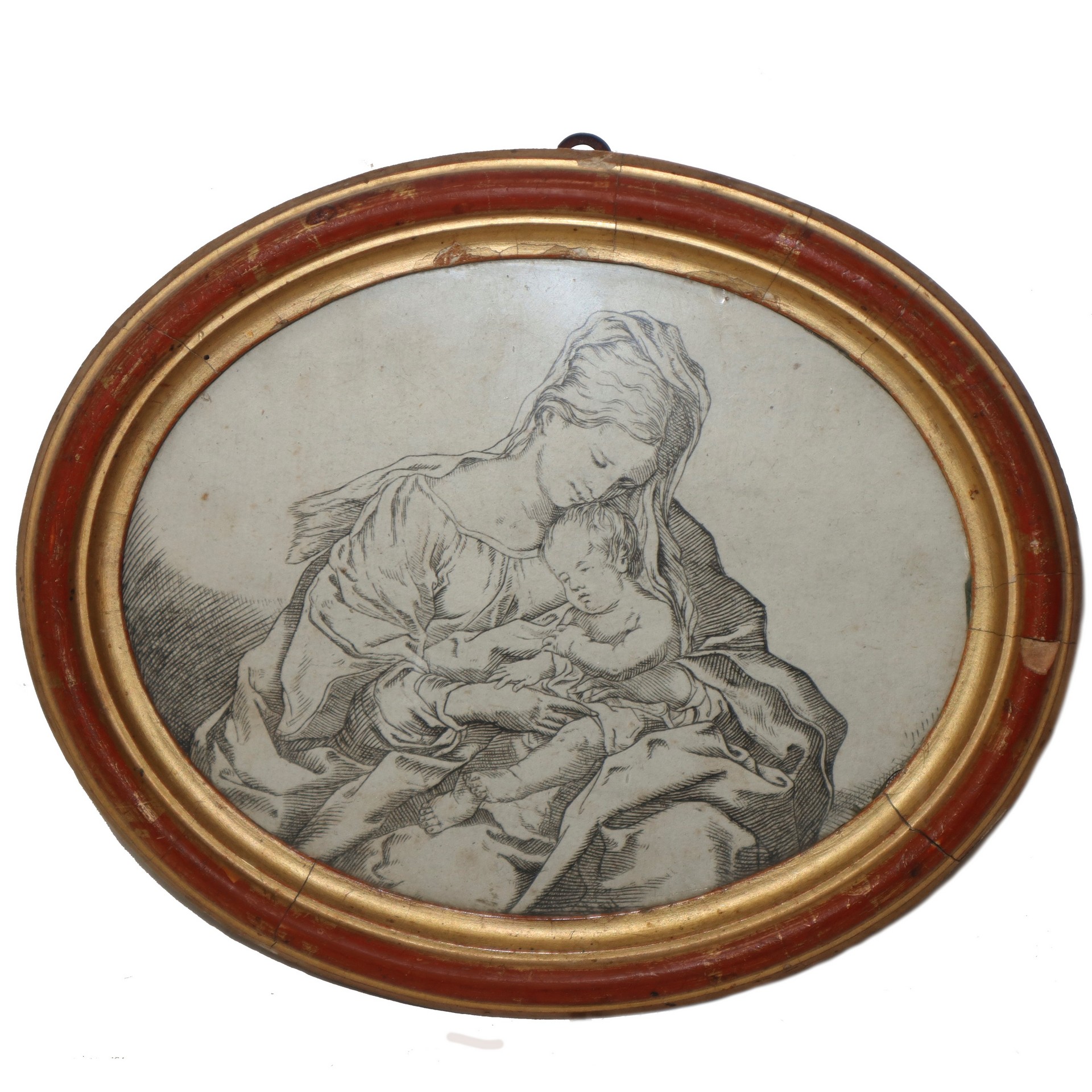 N°2 incisioni, La grandezza del gigante comparso nel carnevale del 1750 e ovale Madonna con bambino, 18th Gigante MM 220 x 157 in cornice cm 26 x 20, Madonna MM 120 x 150 in cornice dorata e laccata cm 15 x 18 Incisione all'acquaforte su carta vergata