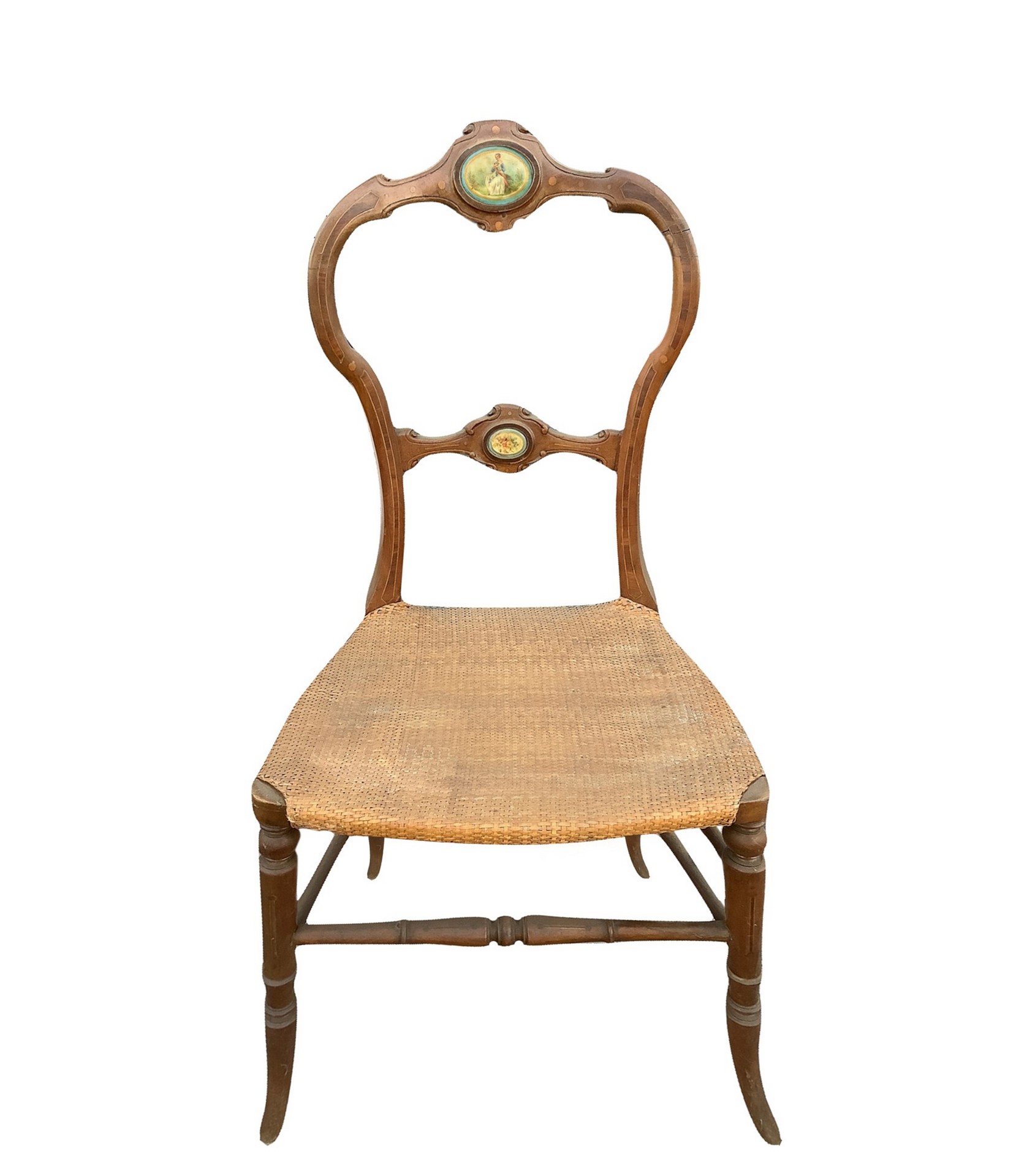 Coppia di sedie in legno, fine 19th cm. 85 x 41 x 39  Seduta e tamburo in paglia di Vienna. Spalliere con 2 miniature raffiguranti scene di genere Seduta e tamburo in paglia di Vienna. Spalliere con 2 miniature raffiguranti scene di genere