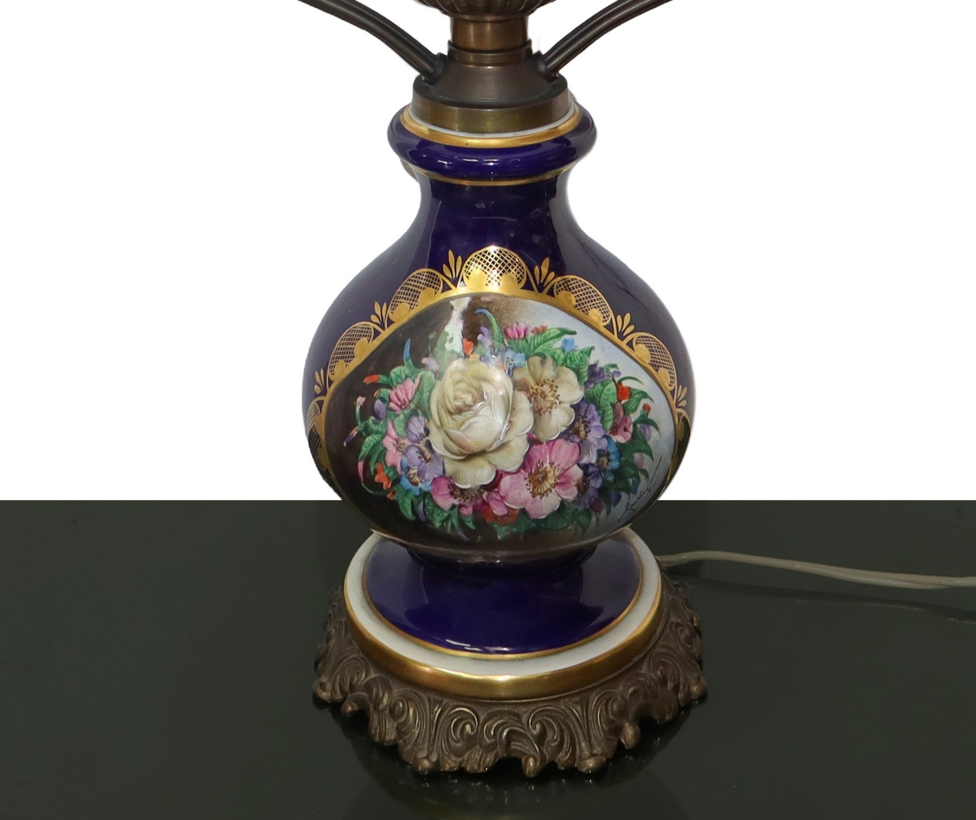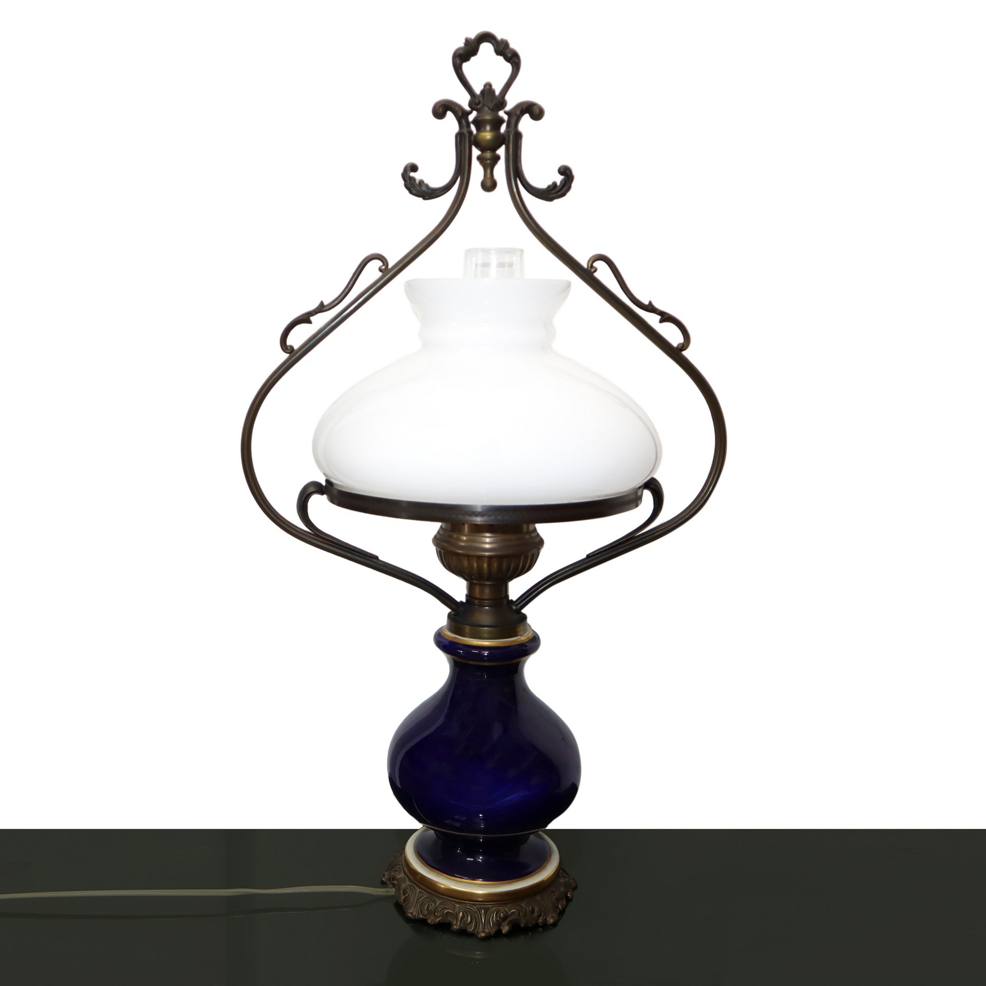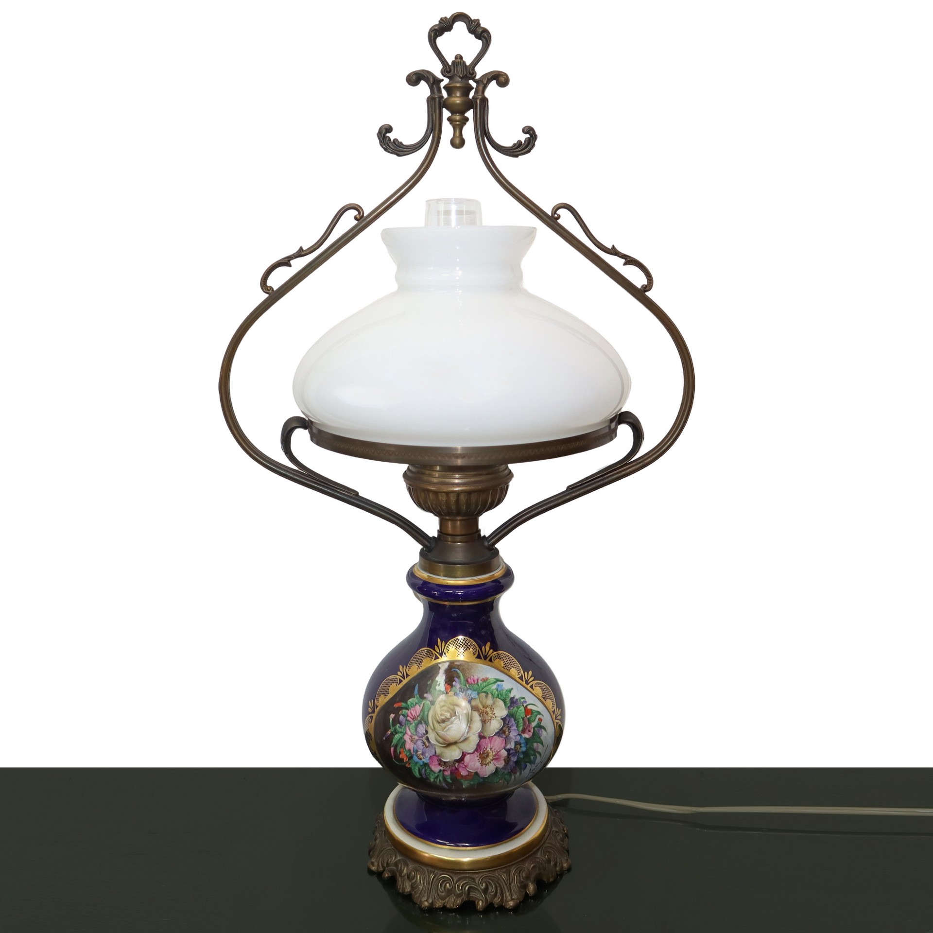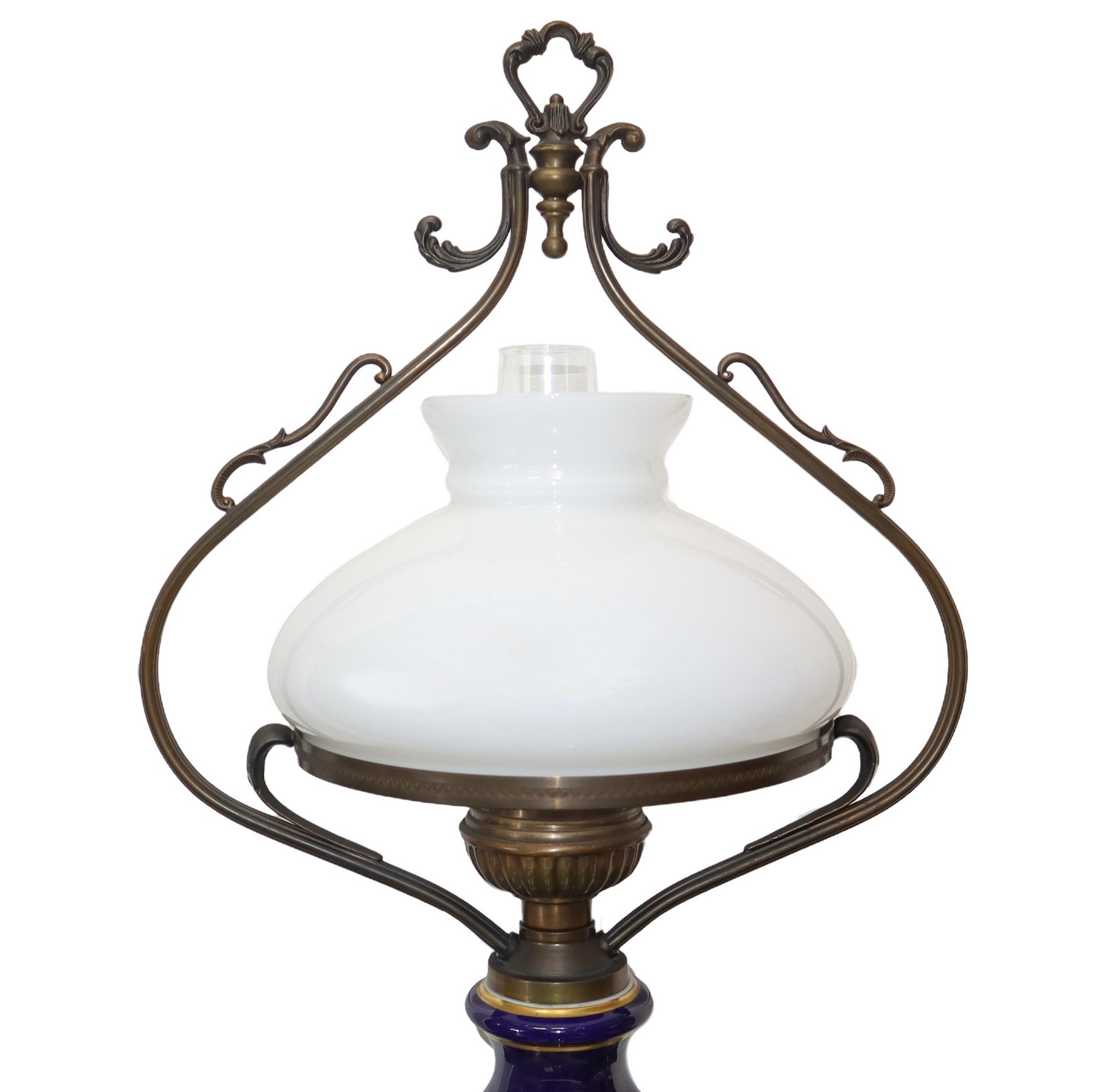 Lume a petrolio con diffusore in opaline H cm 70 Base in porcellana dipinta stile Sevres. ElettrificatoBase in porcellana dipinta stile Sevres. Elettrificato
