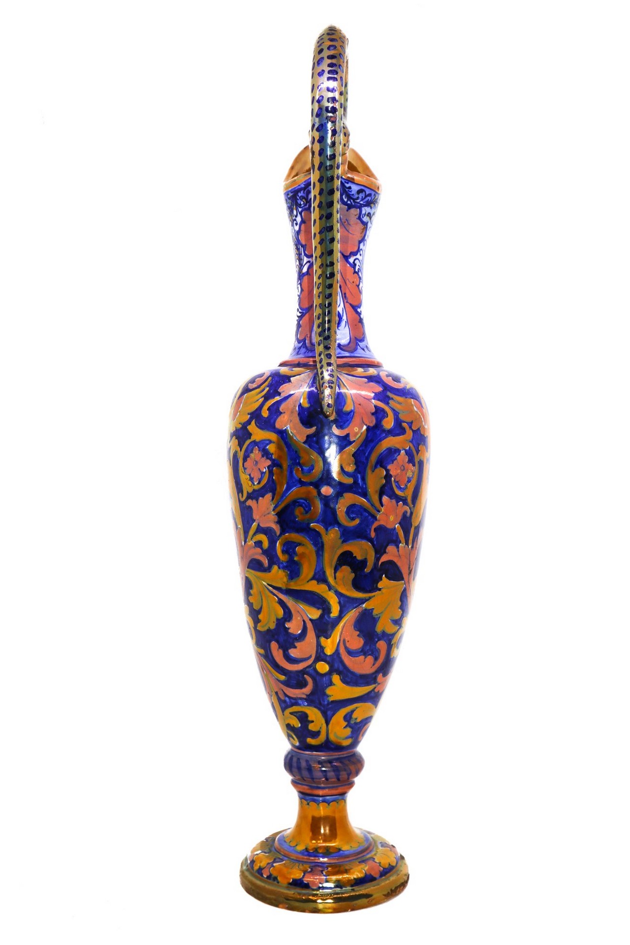 Anfora in ceramica smaltata a lustro h cm 40 Con manico e medaglione centrale e disegni di puttini laterali, disegno a larghe foglie in oro.Con manico e medaglione centrale e disegni di puttini laterali, disegno a larghe foglie in oro.