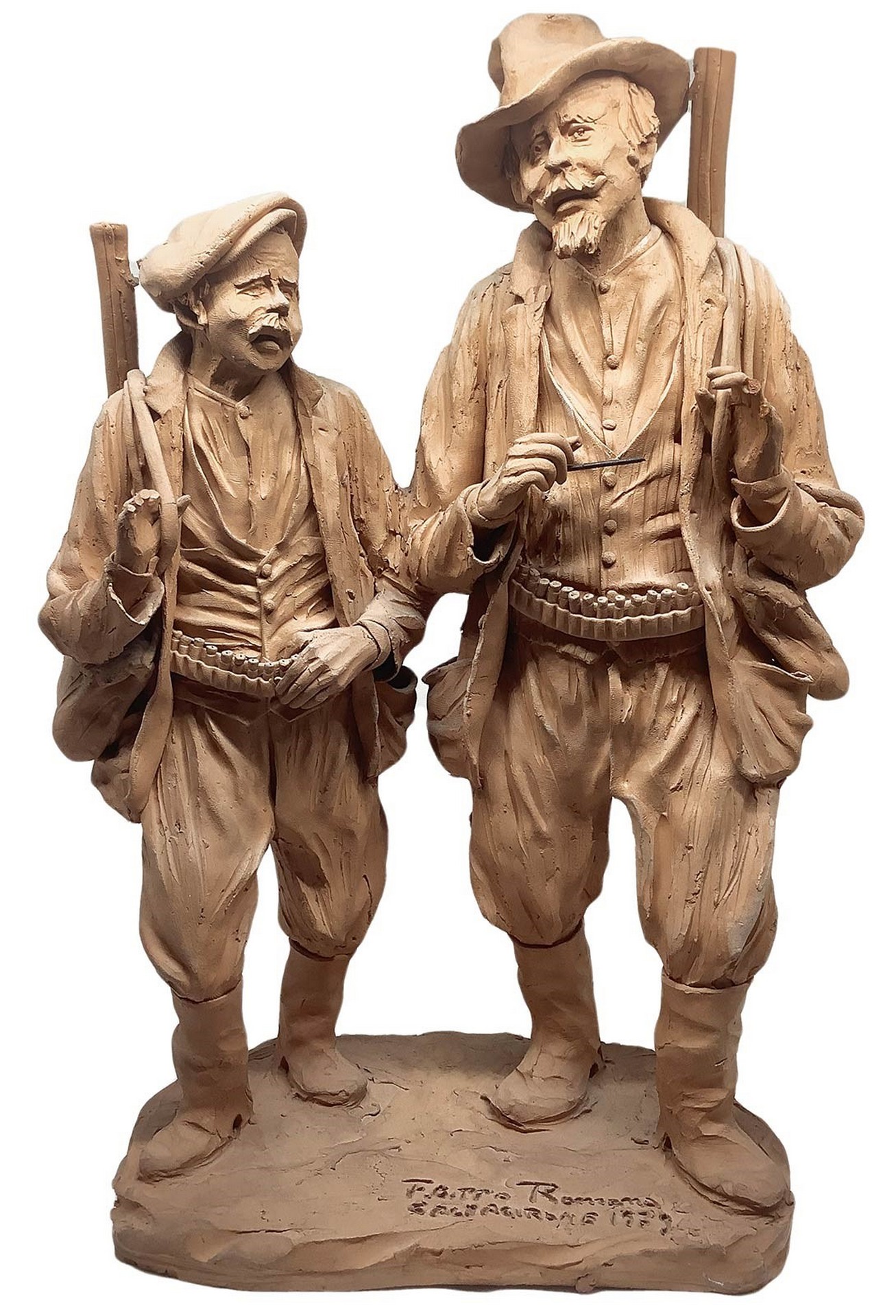 Figurina in terracotta monocroma raffigurante coppia di cacciatori con fucile. H cm 35.  Firmata Filippo Romano e datata Caltagirone 1979 alla base. Piccole mancanze alle dita.   Firmata Filippo Romano e datata Caltagirone 1979 alla base. Piccole mancanze alle dita.