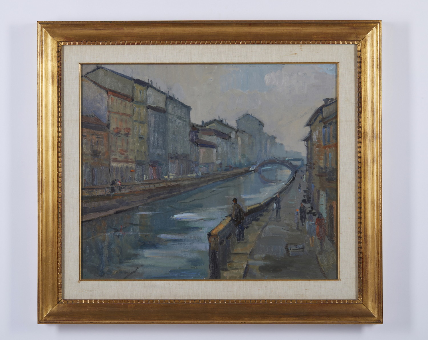 CAROZZI ENRICO (1910 - 1985) NAVIGLIO. olio su tela. Cm 60,00 x 50,00. al retro firma e dedica. . Cornice presente