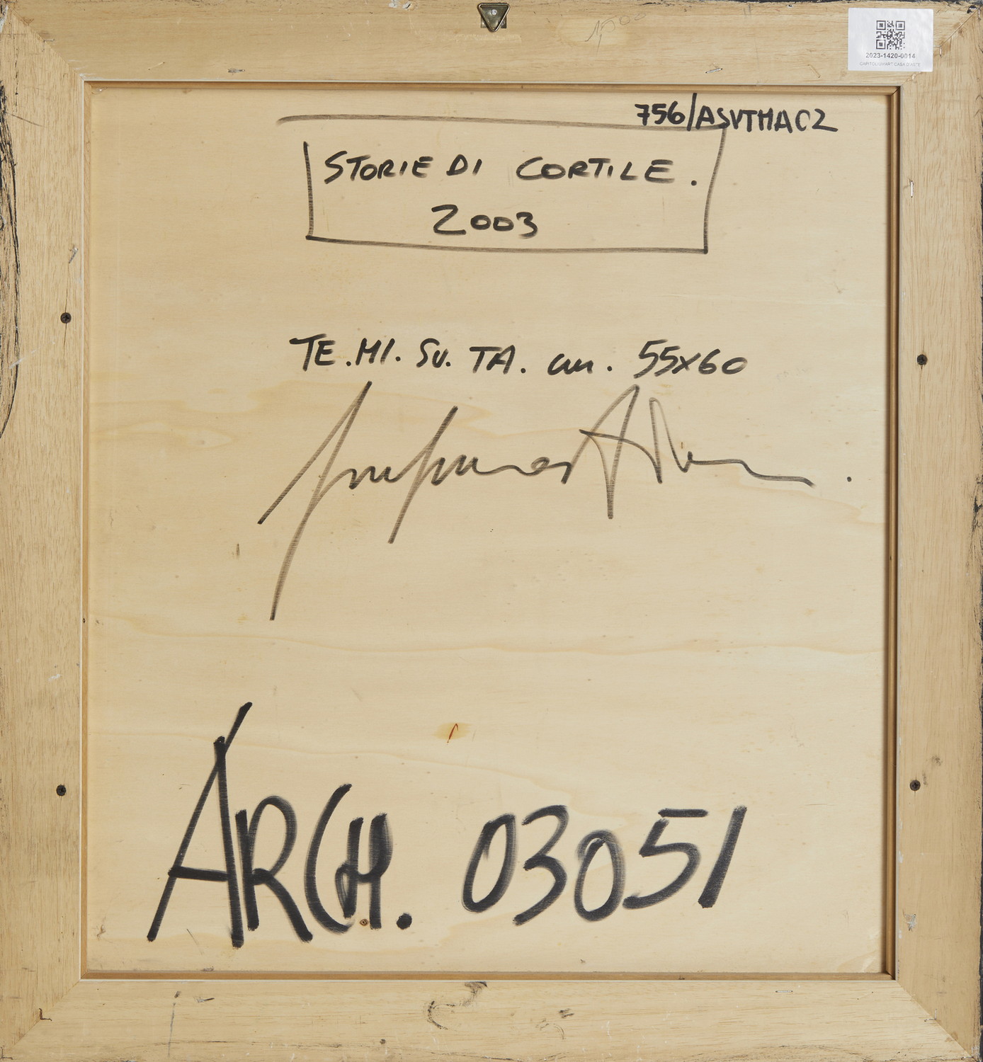 ASVERI GIANFRANCO (n. 1948) STORIA DI CORTILE, 2003. tecnica mista su tavola. Cm 55,00 x 60,00. sul retro: titolo, anno e firma. Cornice presente