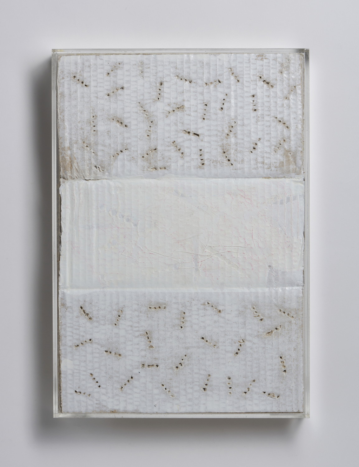 MASI PAOLO (n. 1933) SENZA TITOLO, 2001. smalto e acrilico su cartone entro teca di plexiglass. Cm 28,50 x 42,00. sul retro: firma e data.