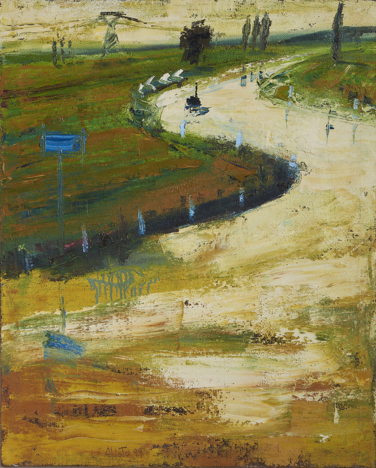 ALIOTO MASSIMILIANO (n. 1972) STRADA FACENDO, 1999. Olio su tela di juta. Cm 80,00 x 100,00. firma e data.